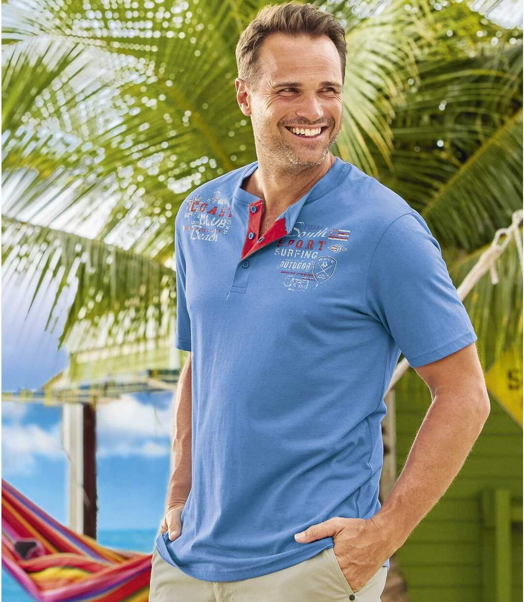 2er-Pack bequeme Henleyshirts: Die beiden Brustaufdrucke dieser T-Shirts aus weichem und anschmiegsamem Jersey (ca. 160 g/m²) sorgen für einen tollen Look! Perfekter Schnitt und tolle Verarbeitung: Rundhals mit Rippbündchen, Knopfleiste mit 3 Knöpfen. Die Unterseite der Knopfleiste in Kontrastfarbe setzt einen dezenten Akzent. Kurze Ärmel und gerader Saum mit Doppelnähten. 60% Baumwolle, 40% Polyester. Rückenlänge bei Größe L: ca. 74 cm. Maschinenwaschbar bei 30°. Auf Links bügeln wegen des Aufdrucks. Farben: 1 x Rot, 1 x Blau – Art.-Nr.: H5160