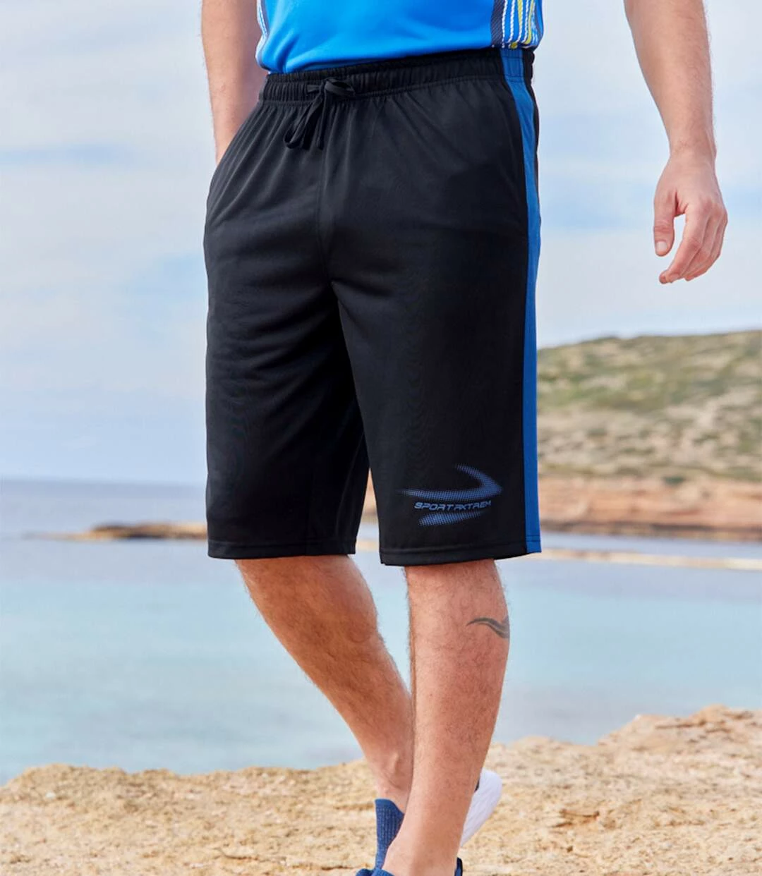 2er-Pack Bermudas Sport Line: Diese superbequemen Bermudas aus weichem Stoff (ca. 220 g/m²) sind optimal für Ihre sportlichen Aktivitäten! Den Elastikbund können Sie mit einer Verstellkordel individuell anpassen. Verarbeitung mit Doppelnähten. Kontraststreifen entlang der Seitennaht. Kleiner Aufdruck auf dem linken Oberschenkel. Schrittlänge bei Größe L: ca. 30 cm, Beinweite: ca. 28 cm. Maschinenwaschbar bei 30°. Bügelfrei. Farben: 1 x Schwarz, 1 x Blau.