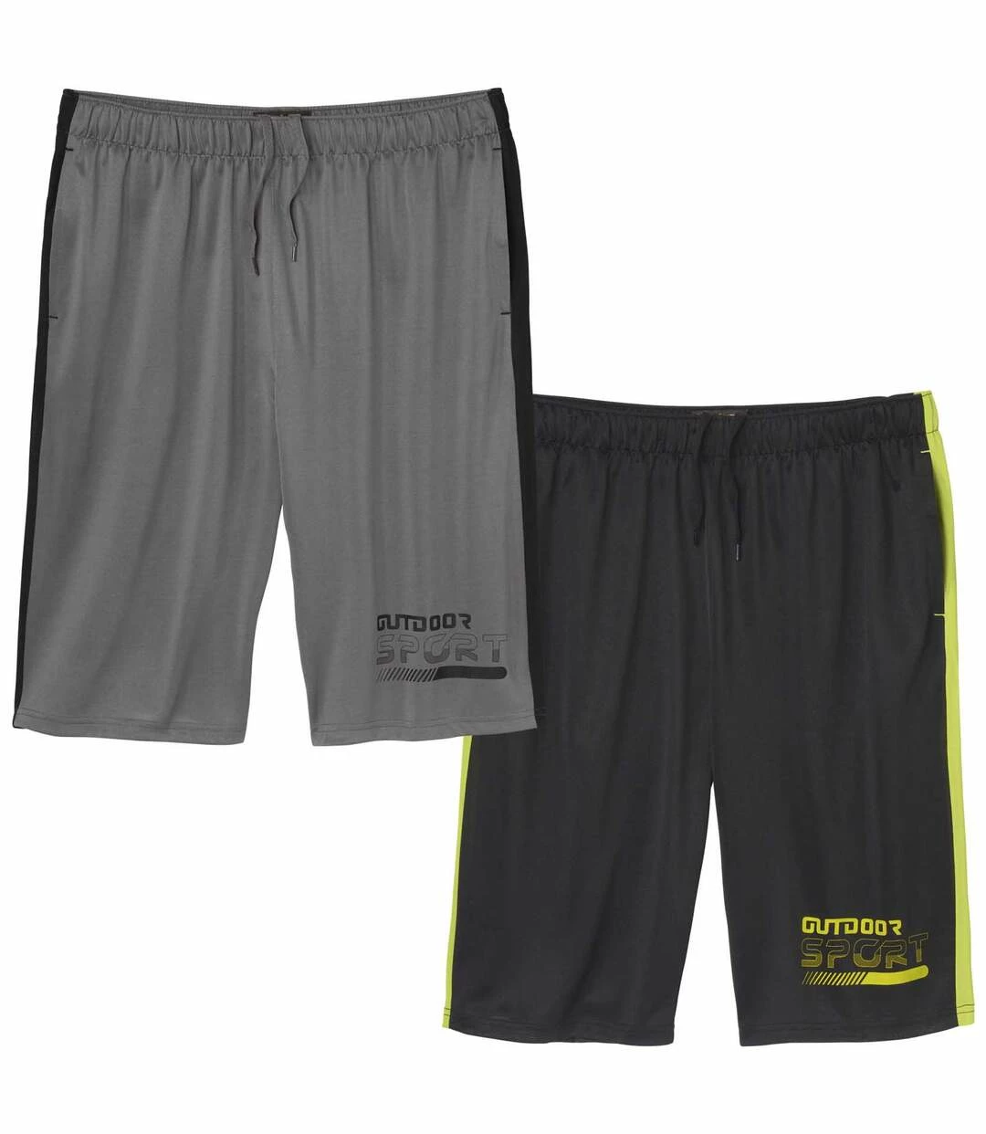 2er-Pack Bermudas Sport Outdoor: Diese beiden Sport-Bermudas werden aus anschmiegsamem und schnell trocknendem Polyester-Jersey (ca. 220 g/m²) hergestellt und sind absolut pflegeleicht. Superbequemer Schnitt mit Elastikbund inkl. Verstellkordel und 2 Seitentaschen. Modische Details: seitlicher Dekorstreifen und Beinaufdruck in Kontrastfarbe. Verarbeitung mit Doppelnähten. 100% Polyester. Schrittlänge bei Größe L: ca. 30 cm, Beinweite: ca. 28 cm. Maschinenwaschbar bei 30°. Bügelfrei. Farben: 1 x Grau, 1 x Schwarz
