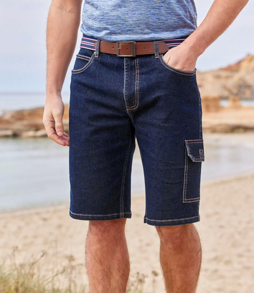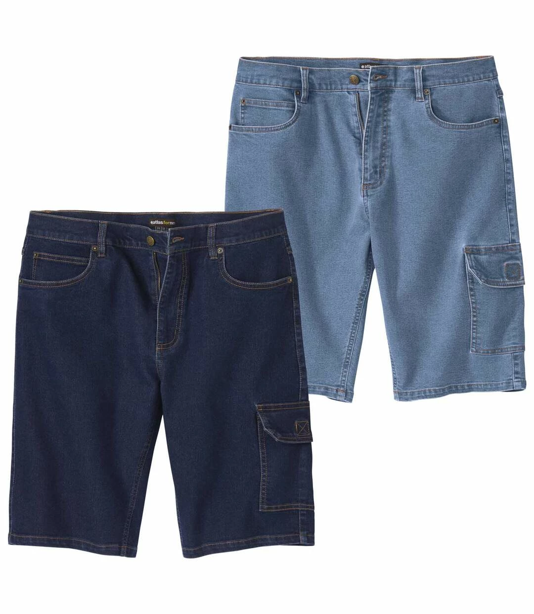 2er-Pack Cargo-Bemudas aus Stretch-Denim: Für Jeans-Fans gibt’s diese Bermudas für den Sommer! Gefertigt werden Sie aus leichtem Stretch-Denim (9,5 oz) im klassischem Jeans-Schnitt mit Kontrastnähten. Der Bund mit Schlaufen wird mit einem Reißverschluss inkl. Abschlussknopf aus Metall verschlossen. 6 Taschen: 2 Einstecktaschen und 1 Münztasche mit Nieten vorne, 2 aufgesetzte Gesäßtaschen und 1 zusätzliche Cargo-Tasche mit Klettklappe. Saum mit Doppelnähten. Kunstleder-Badge auf der Rückseite des Bundes. Schrittlänge bei Größe 50: ca. 30 cm, Beinweite: ca. 26 cm. Maschinenwaschbar bei 30°. Farbe: 1 x Dunkelblau, 1 x Hellblau.