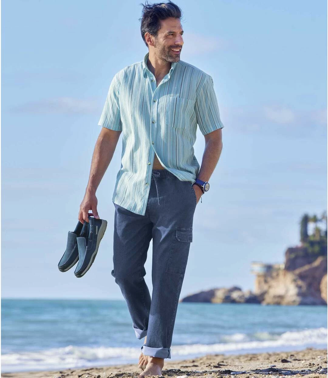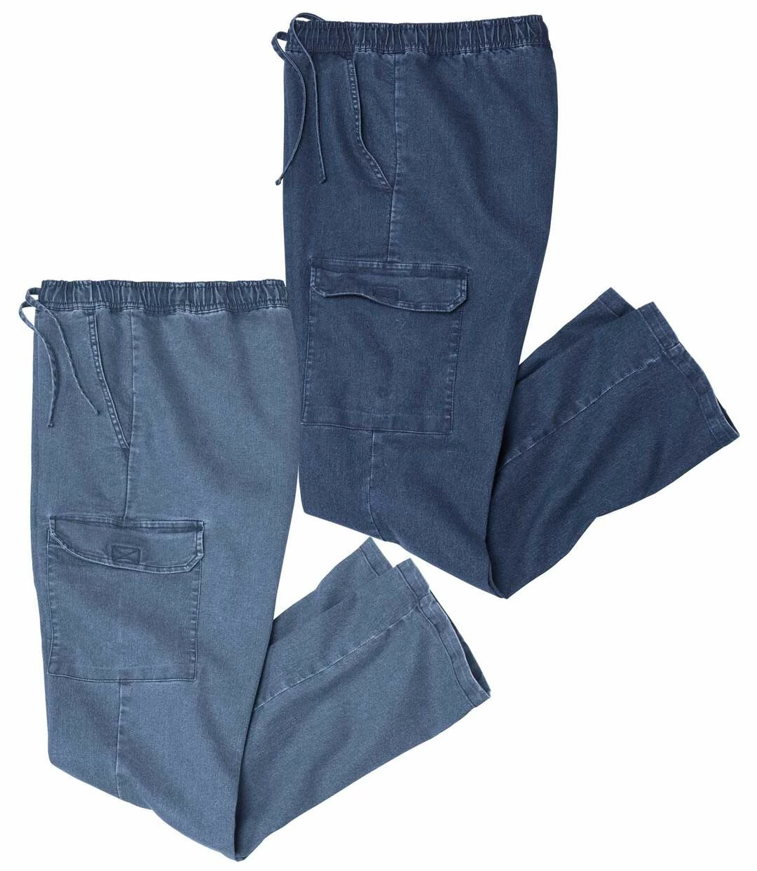 2er-Pack Cargo-Jeans Top Komfort: Ein unentbehrliches Duo! Für diesen Sommer empfehlen wir Ihnen die lässige und bequeme Variante der Jeans! Diese beiden Freizeithosen werden aus leichtem Stretch-Denim (9,5 oz) gefertigt. Sie sind mit einem Elastikbund ausgestattet, den Sie mit der Verstellkordel ruckzuck individuell anpassen können. Die Modelle in 2 abgestuften Farbvarianten haben 3 praktische Taschen: 2 Einstecktaschen vorne und 1 Beintasche mit Klettklappe. Die vielseitig zu kombinierenden Hosen sind ideal für den Urlaub! 81% Baumwolle, 17% Polyester, 2% Elasthan. Schrittlänge bei Größe L: ca. 84 cm, Fußweite: ca. 22 cm. Maschinenwaschbar bei 30°. Farben: 1 x Blau, 1 x Hellblau