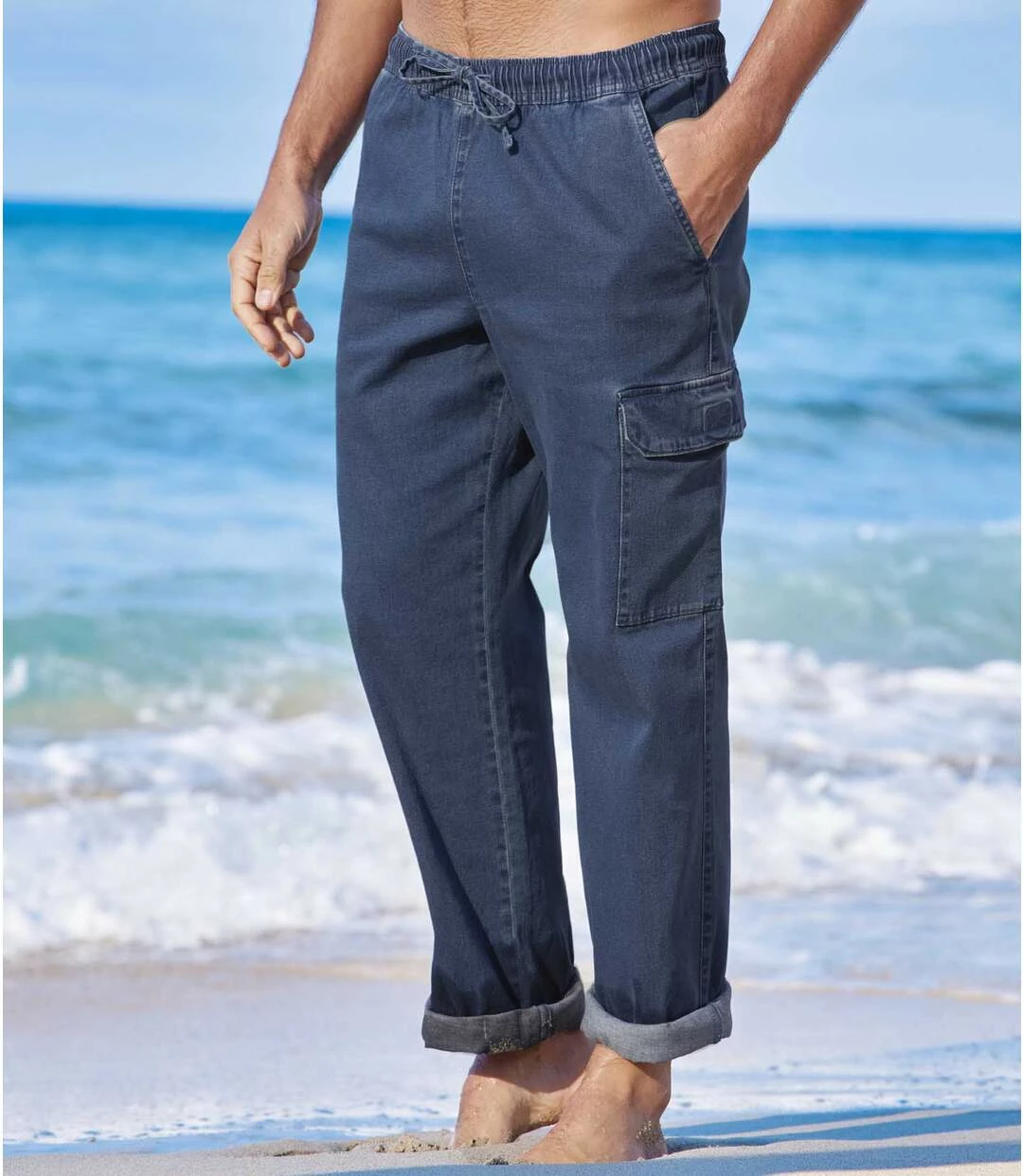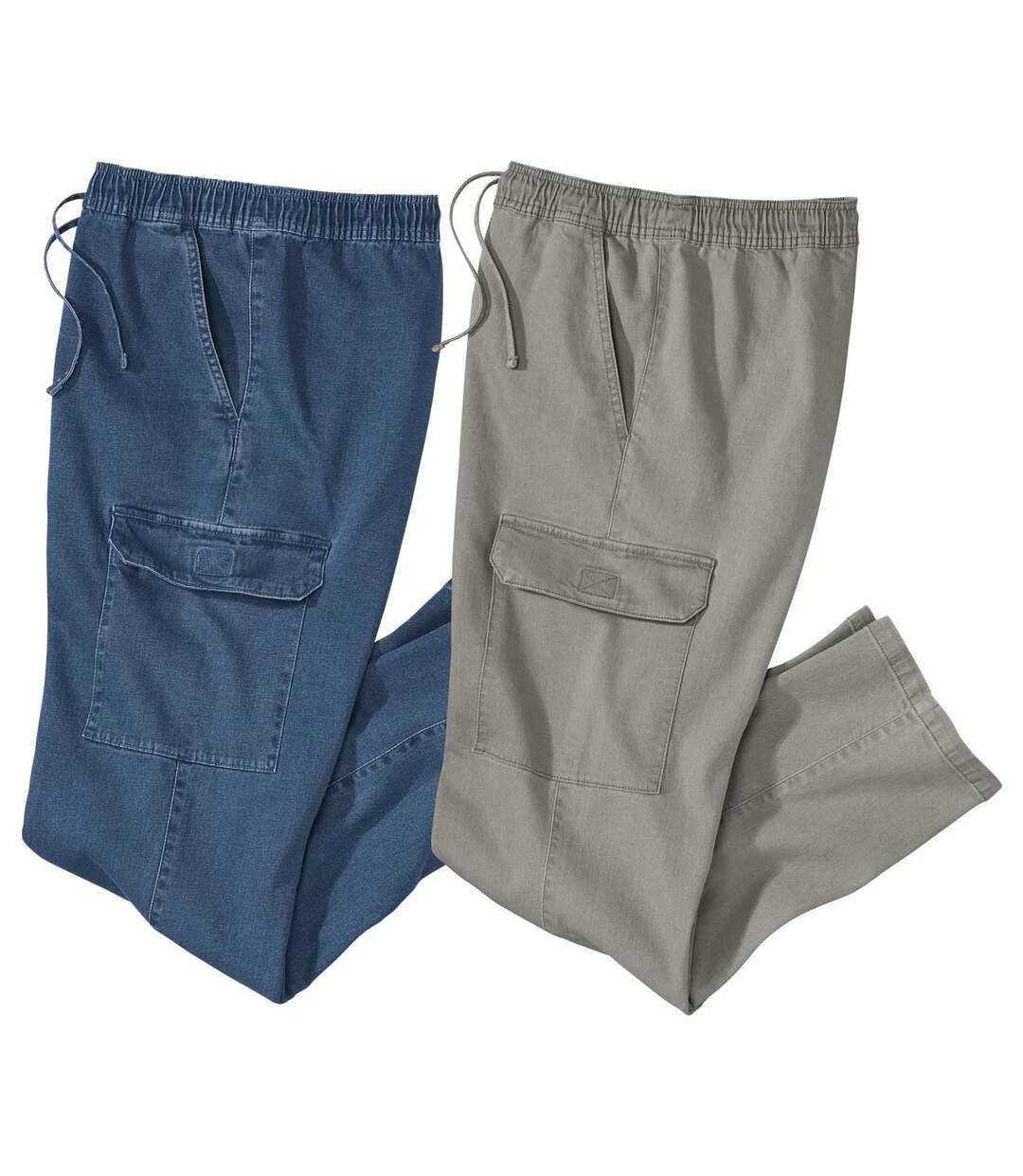 2er-Pack Freizeit-Jeans: Hier kommen die perfekten Wohlfühl-Hosen! Sie sind aus leichtem Denim (9,5 oz) und haben einen bequemen Elastikbund, den Sie dank der außenliegenden Verstellkordel mit einem Handgriff individuell anpassen. Die Modelle haben 3 praktische Taschen: 2 seitliche Einstecktaschen und 1 Cargo-Tasche mit Klettklappe auf dem linken Oberschenkel. 98% Baumwolle, 2% Elasthan. Schrittlänge bei Größe L: ca. 84 cm, Beinweite: ca. 22 cm. Maschinenwaschbar bei 30°. Farben: 1 x Blau, 1 x Grau – Art.-Nr.: K3132