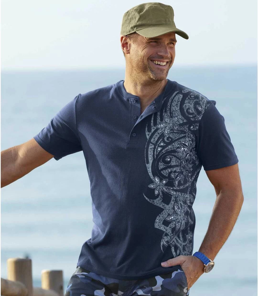 2er-Pack Henleyshirts mit Tahiti-Motiv: Mit diesen Henleyshirts aus weicher Baumwolle (ca. 160 g/m²) kommt Urlaubsstimmung auf! Die perfekt geschnittenen Modelle begeistern mit ihrem großformatigen Aufdruck im Stil der polynesischen Kunst. Schöne Verarbeitung: Rundhalsausschnitt mit Rippbündchen und Knopfleiste mit 3 Knöpfen Ton in Ton. Die kurzen Ärmel und der Saum sind mit Doppelnähten verarbeitet. 100% Baumwolle. Rückenlänge bei Größe L: ca. 74 cm. Maschinenwaschbar bei 30°. Auf Links bügeln wegen des Aufdrucks. Farben: Dunkelblau und Rot.