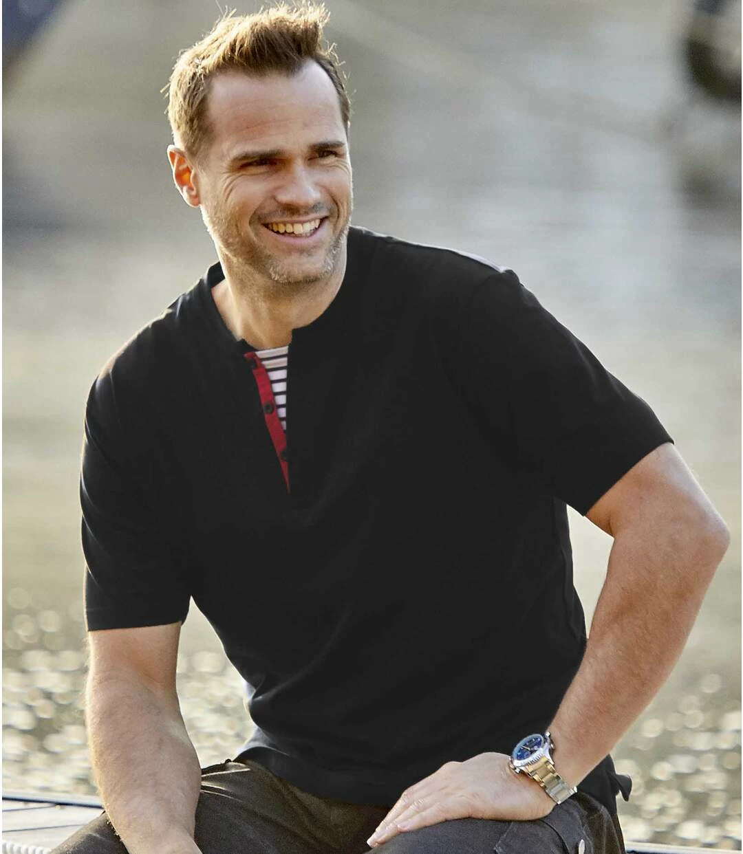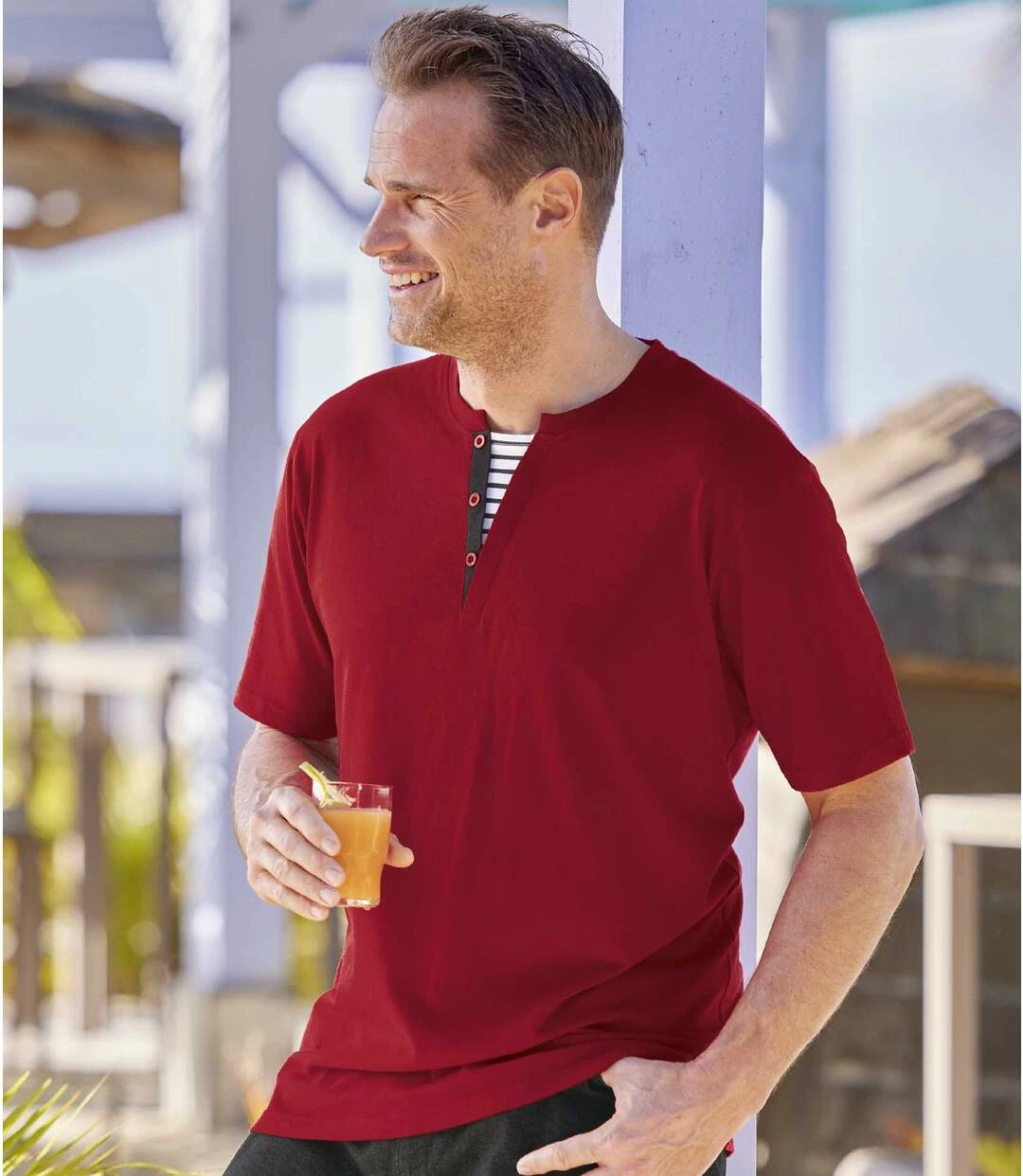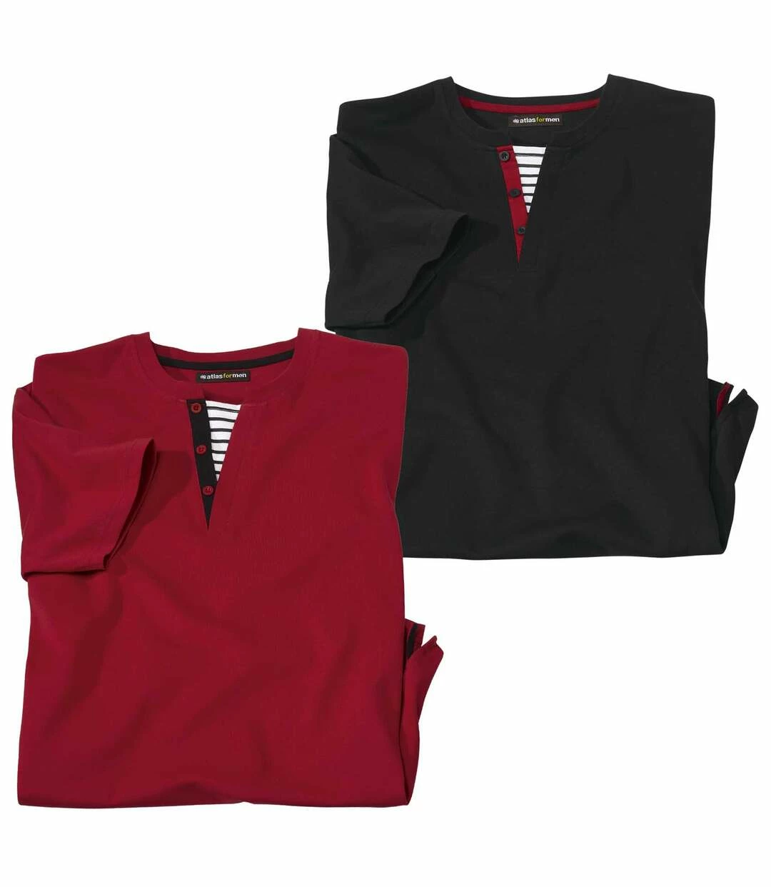2er-Pack Henleyshirts Sailing: Hier kommen 2 Henleyshirts, die wie gemacht sind für einen Aufenthalt am Meer. Das besondere modische Detail ist der angedeutete Henley-Kragen, der blau-weiß gestreift unterlegt ist und einen dezenten Matrosenlook erzeugt. Die superbequemen Shirts werden aus angenehmem Jersey (ca. 160 g/m²) gefertigt und bieten dank des weiten Schnitts lässigen Tragekomfort. Sorgfältige Verarbeitung: Rundhals mit Rippbündchen, Nackenband, kurze Ärmel und gerader Saum mit Doppelnähten. 100% Baumwolle. Rückenlänge bei Größe L: ca. 74 cm. Maschinenwaschbar bei 30°. Farben: 1 x Rot, 1 x Schwarz – Art.-Nr.: H6127