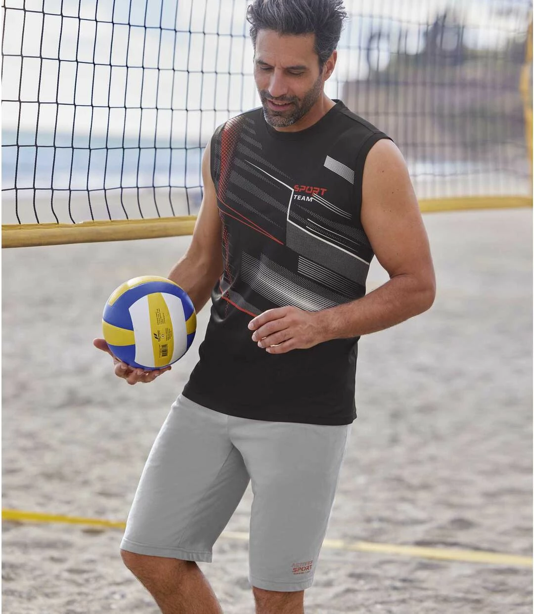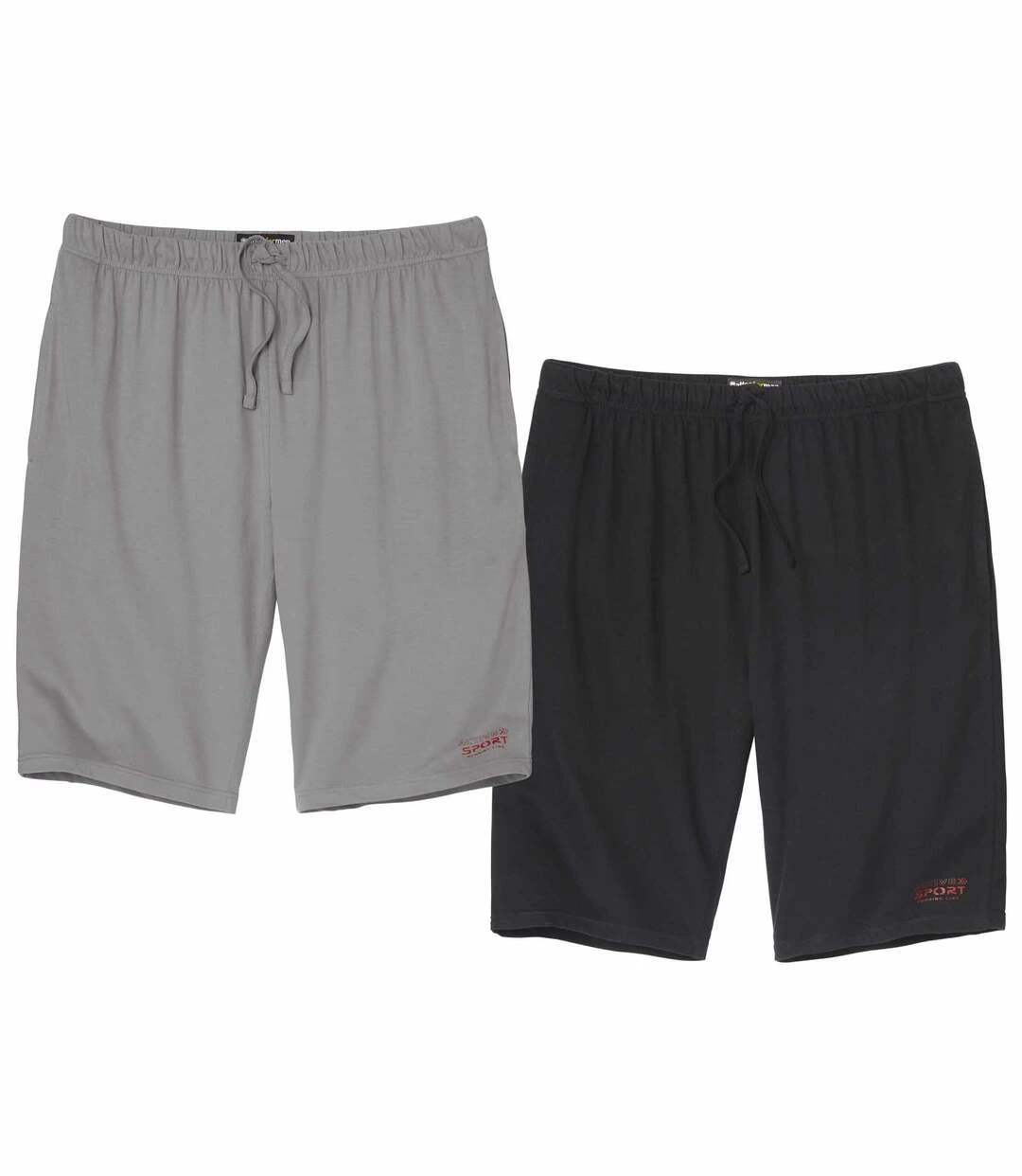 2er-Pack Jersey-Bermudas Active Sport: Sowohl für sportliche Aktivitäten als auch für das süße Nichtstun sind diese beiden Bermudas aus leichtem, weichem und bequemem Jersey (ca. 145 g/m²) unentbehrlich! Elastikbund mit Verstellkordel und 2 praktische Seitentaschen. Verarbeitung mit Doppelnähten. Kleiner Aufdruck am Saum. 60% Baumwolle, 40% Polyester. Schrittlänge bei Größe L: ca. 30 cm, Beinweite: ca. 28 cm. Maschinenwaschbar bei 30°. Farben: 1 x Grau, 1 x Schwarz