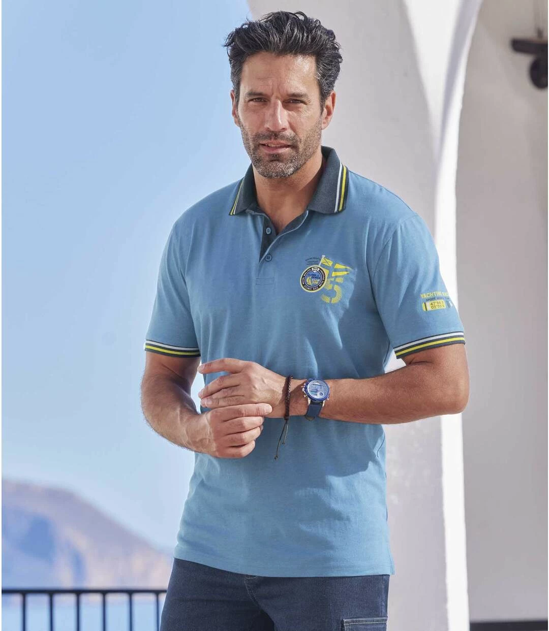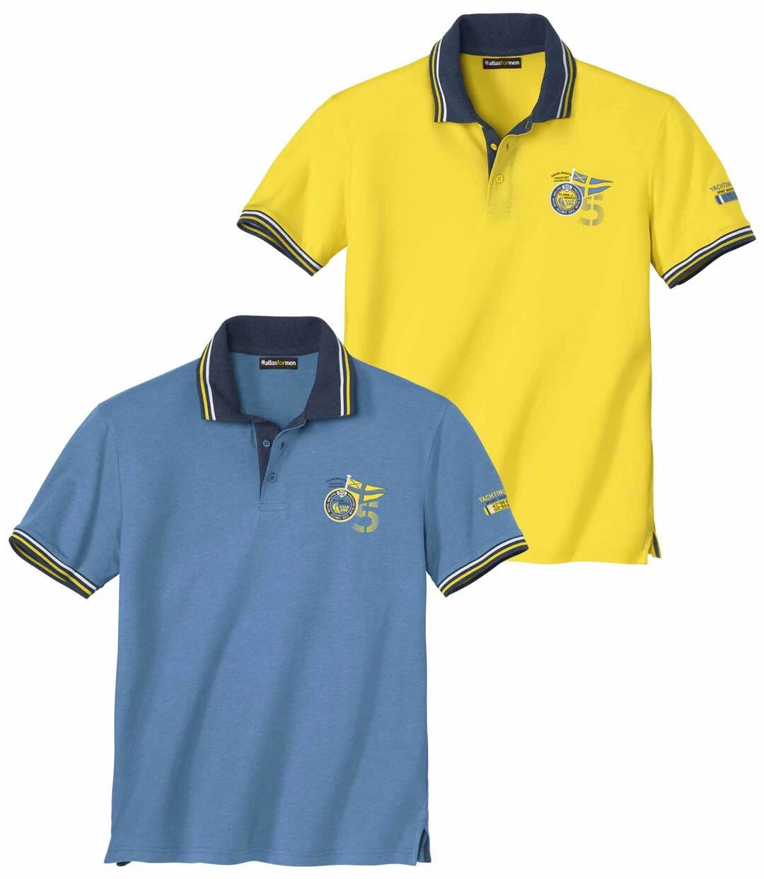 2er-Pack Jersey-Poloshirts Newport: Diese kurzärmeligen Poloshirts aus weichem und anschmiegsamem Jersey (ca. 160 g/m²) haben ein Design wie die Polos eines Segelclubs! Dank des weiten Schnitts und der Verarbeitungsdetails eignen sie sich ideal für einen sonnigen Tag am Wasser. Elegante Details: gestreifte Rippbündchen am Kragen und an den Ärmeln, Nackenband, Unterseite der Knopfleiste und Verstärkungen der Seitenschlitze in Kontrastfarbe. Weiter Schnitt. Verarbeitung mit Doppelnähten. 60% Baumwolle, 40% Polyester. Rückenlänge bei Größe L: ca. 74 cm. Maschinenwaschbar bei 30°. Farben: 1 x Gelb, 1 x Blau