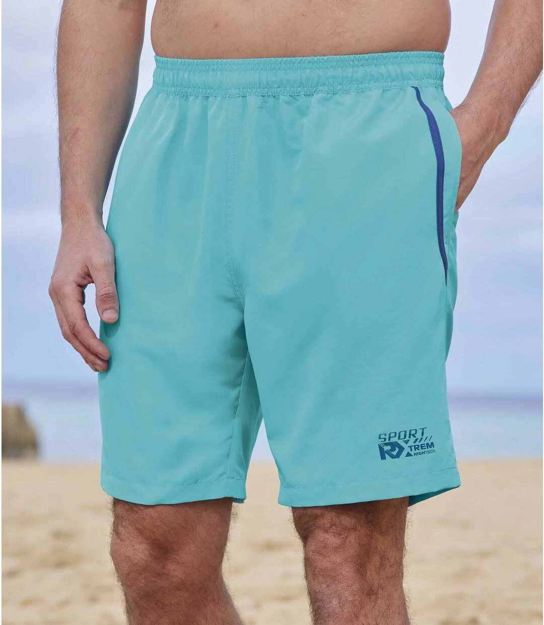 2er-Pack Microfaser-Shorts Sporting: Wenn Sport und Spaß angesagt sind im Urlaub, dann ist der Moment für diese beiden Shorts aus leichter und schnell trocknender Microfaser (ca. 110 g/m²) gekommen. Bequemer Schnitt mit Elastikbund inkl. Verstellkordel in Kontrastfarbe. Sorgfältige Verarbeitung: 2 Seitentaschen, seitliche Dekorbänder in Kontrastfarbe und exklusiver Beinaufdruck. Schrittlänge bei Größe L: ca. 20 cm, Beinweite: ca. 29 cm. Maschinenwaschbar bei 30°. Bügelfrei. Farben: 1 x Dunkelblau, 1 x Türkis.