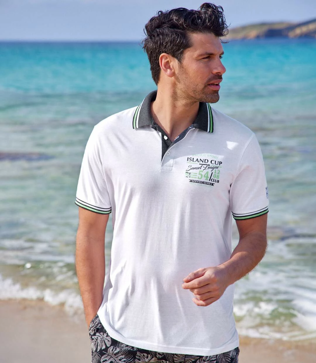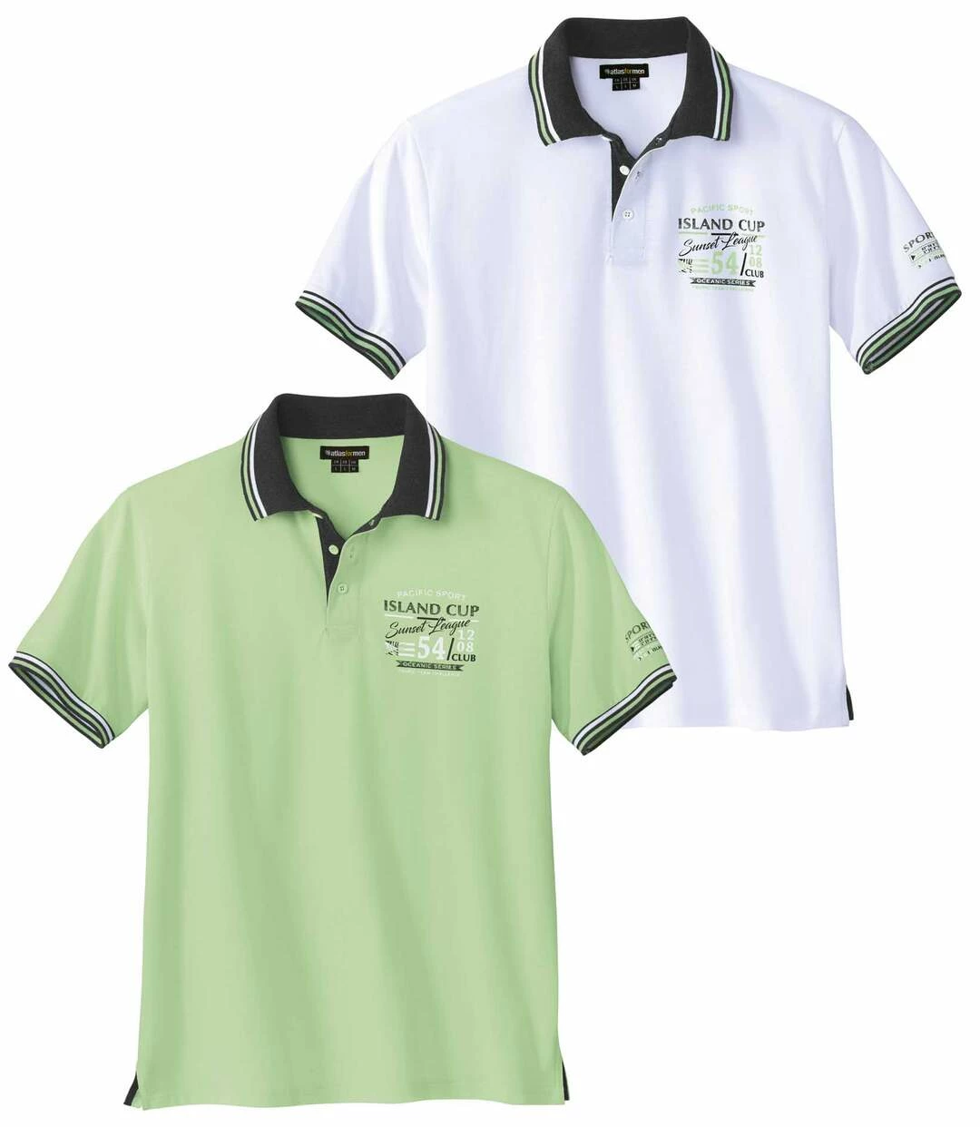 2er-Pack Poloshirts Island Cup: Für einen Segeltörn greifen Sie am besten zu diesen beiden Poloshirts aus herrlich weichem und anschmiegsamem Jersey (ca. 160 g/m²) mit nautischen Printmotiven auf der Brust und am Ärmel. Die hochwertige Verarbeitung garantiert exzellente Passform: Rippbündchen am Kragen und an den Ärmeln, verstärkte Seitenschlitze. Kontrastdetails verleihen den Modellen Eleganz: Unterseite der Knopfleiste, Innenseiten der Seitenschlitze, Kragen und Ärmelabschlüsse. Knöpfe mit Gravur. Rückenlänge bei Größe L: ca. 74 cm. Maschinenwaschbar bei 30°. Auf Links bügeln wegen des Aufdrucks. Farben: 1 x Grün, 1 x Weiß.