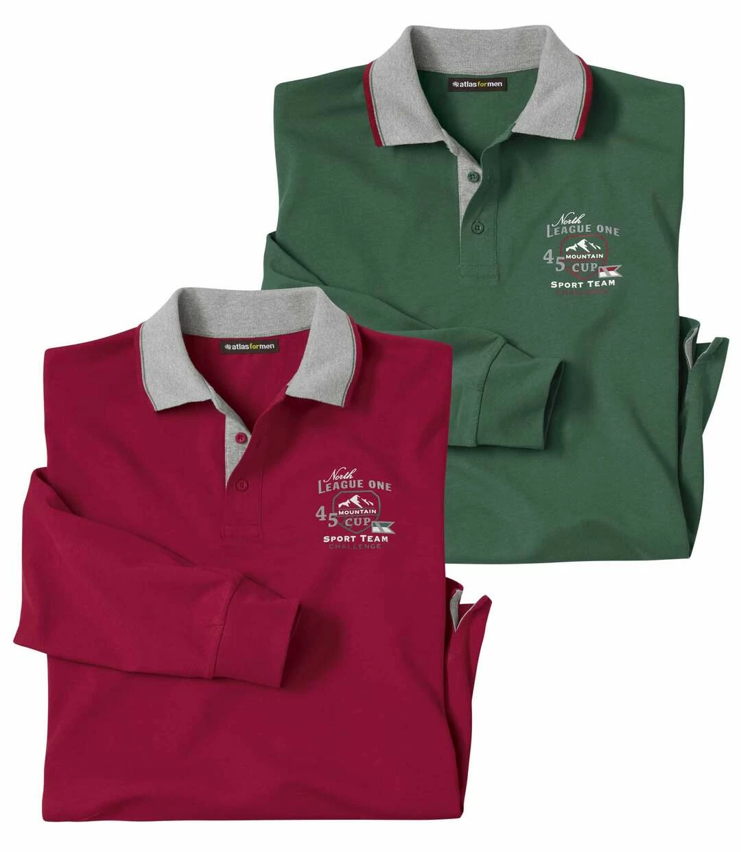 2er-Pack Poloshirts League One: Diese beiden Poloshirts verbinden sportiven Stil mit Chic! Sie werden aus dickem, bequemem Jersey (ca. 180 g/m²) gefertigt und tragen sich sehr angenehm! Für einen modischen Akzent sorgen die kontrastierenden Rippbündchen am Kragen mit dünnem Dekorstreifen sowie die kontrastierende Unterseite der Knopfleiste. Der einwandfreie Polo-Schnitt weist hochwertige Details aus: Nackenband, Knopfleiste, lange Ärmel mit Rippbündchen, gerader Saum mit Doppelnaht, Seitenschlitze mit kontrastierenden Verstärkungen. Verarbeitung mit Doppelnähten. 100% Baumwolle. Rückenlänge bei Größe L: ca. 74 cm. Maschinenwaschbar bei 30°. Farben: 1 x Bordeaux, 1 x Grün – Art.-Nr.: K6105
