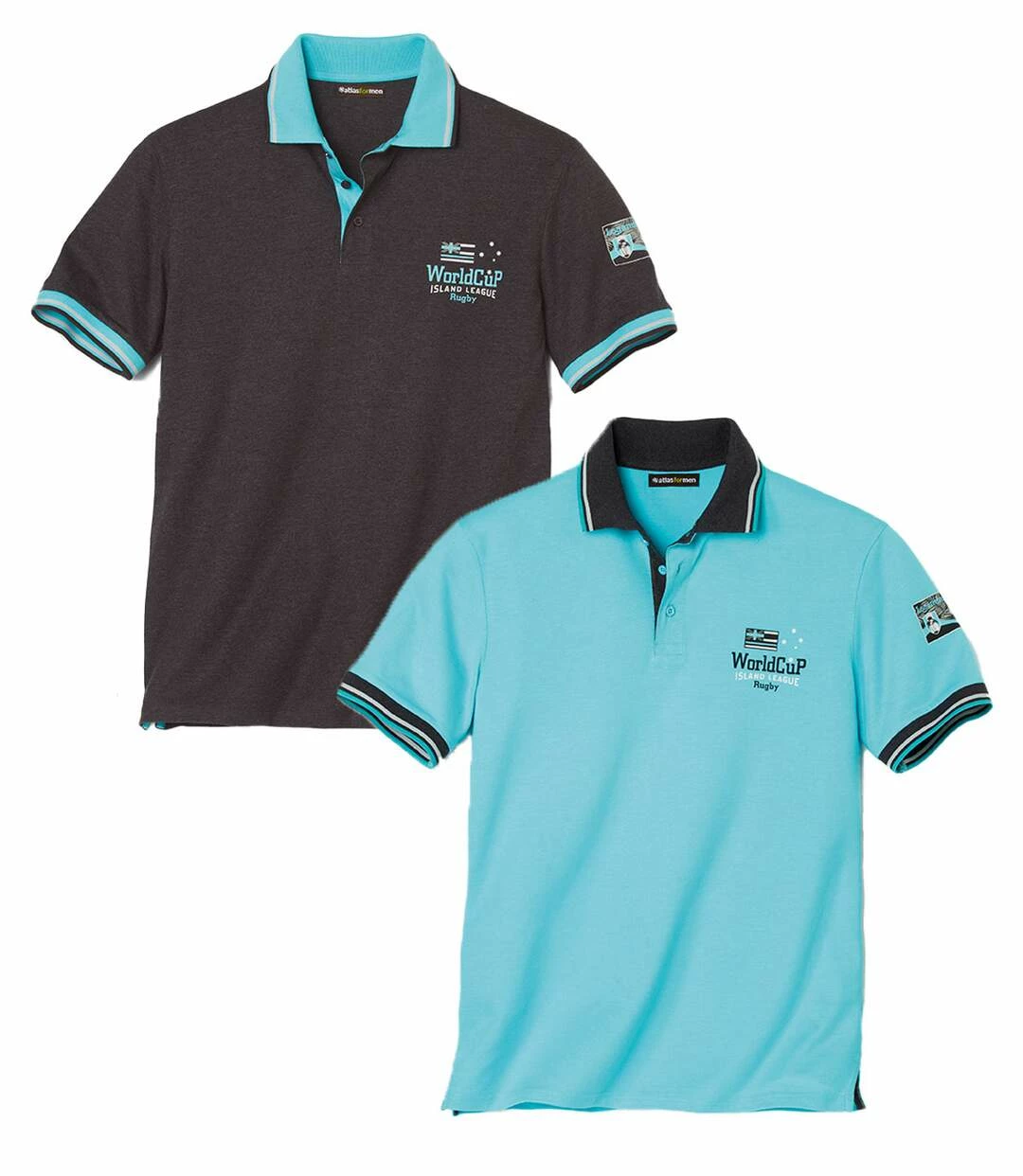 2er-Pack Poloshirts mit Brustaufdruck: Gönnen Sie sich den lässigen Chic dieser beiden anschmiegsamen kurzärmeligen Poloshirts aus Jersey (ca. 160 g/m²), der perfekten Sitz garantiert. Der Brustaufdruck und der Aufdruck auf dem linken Ärmel sorgen für sportives Flair. Sorgfältige Verarbeitung: Kragen und kurze Ärmel mit gestreiften Rippbündchen, Unterseite der Knopfleiste in Kontrastfarbe. Verstärkte Seitenschlitze mit Kontrastdetails für lässiges Tragegefühl. Saum mit Doppelnähten. 60% Baumwolle, 40% Polyester. Rückenlänge bei Größe L: ca. 74 cm. Maschinenwaschbar bei 30°. Farben: 1 x Türkis, 1 x Schwarz – Art.-Nr.: G0158