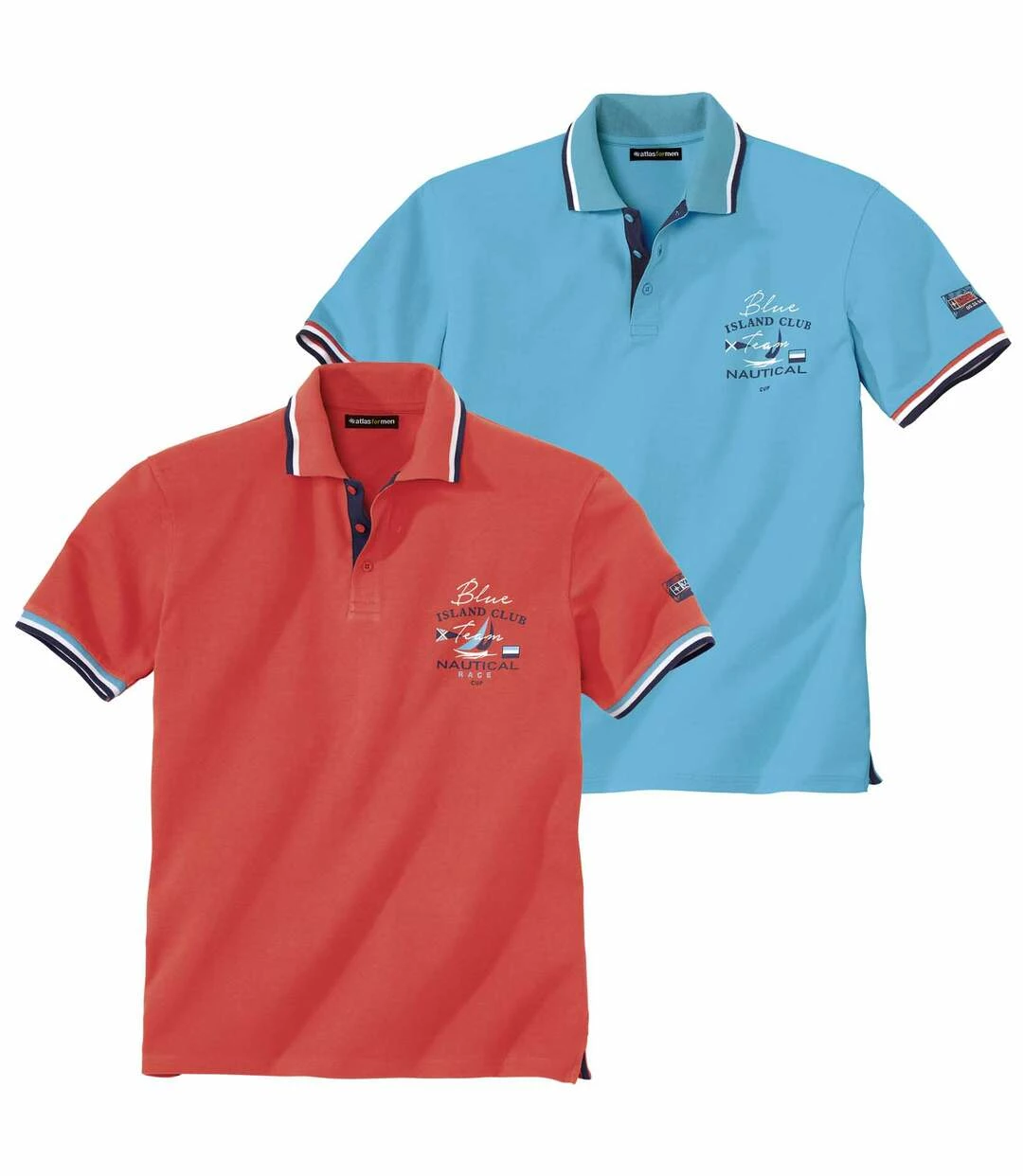 2er-Pack Poloshirts Nautical in Piqué-Qualität: Freuen Sie sich auf den lässigen Chic dieser beiden kurzärmeligen Poloshirts in den Farben der tropischen Inseln! Sie werden aus herrlichem Piqué-Jersey (ca. 200 g/m²) hergestellt und begeistern mit exzellenter Passform! Hochwertige Verarbeitung mit Kontrastdetails: Kragen und Ärmel mit gestreiften Rippbündchen, Unterseite der Knopfleiste, Seitenschlitze. Aufdrucke im Nautik-Look auf der Brust und am linken Ärmel. Saum mit Doppelnaht. Nackenband. 100% Baumwolle. Rückenlänge bei Größe L: ca. 74 cm. Maschinenwaschbar bei 30°. Auf Links bügeln wegen des Aufdrucks. Farben: 1 x Himmelblau, 1 x Koralle – Art.-Nr.: K0112