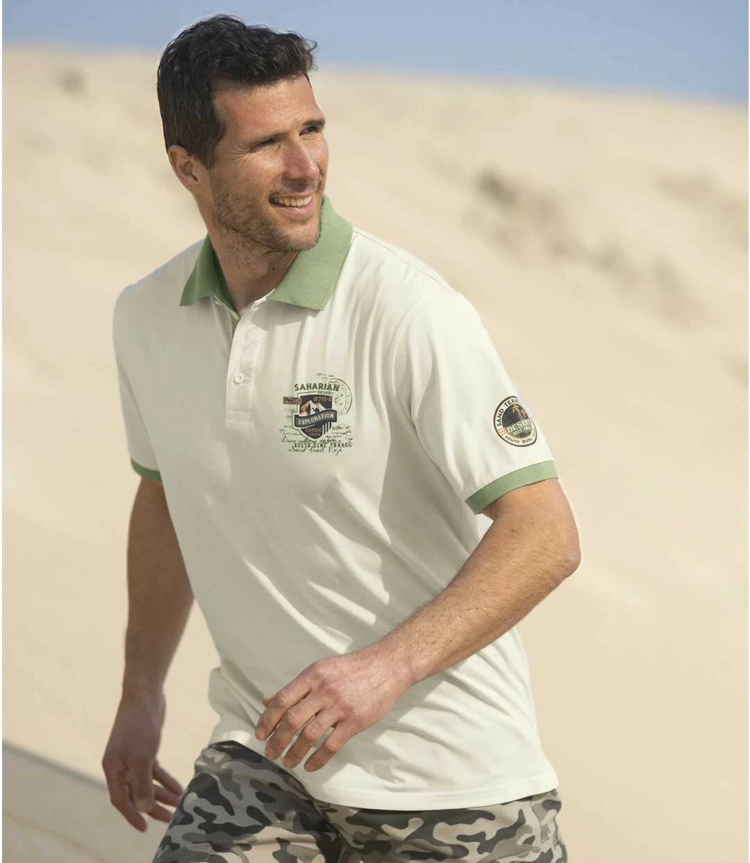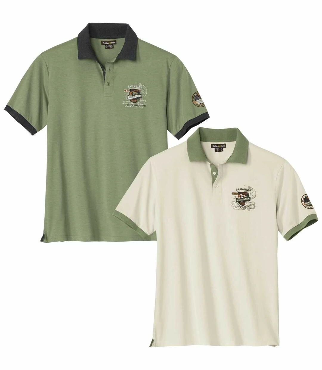 2er-Pack Poloshirts Saharian Desert: Diese beiden Poloshirts mit klassischem Schnitt unterscheiden sich durch die 2 exklusiven Aufdrucke auf der Brust und am linken Ärmel. Die Modelle aus weichem und bequemem Jersey (ca. 160 g/m²) haben Rippbündchen in Kontrastfarbe am Kragen und an den Ärmeln. Knopfleiste mit 3 Knöpfen Ton in Ton. Unterseite der Knopfleiste in Kontrastfarbe. Die Seitenschlitze sind mit Ripsband verstärkt. Rückenlänge bei Größe L: ca. 74 cm. Maschinenwaschbar bei 30°. Auf Links bügeln wegen des Aufdrucks. Farben: 1 x Beige, 1 x Khaki.