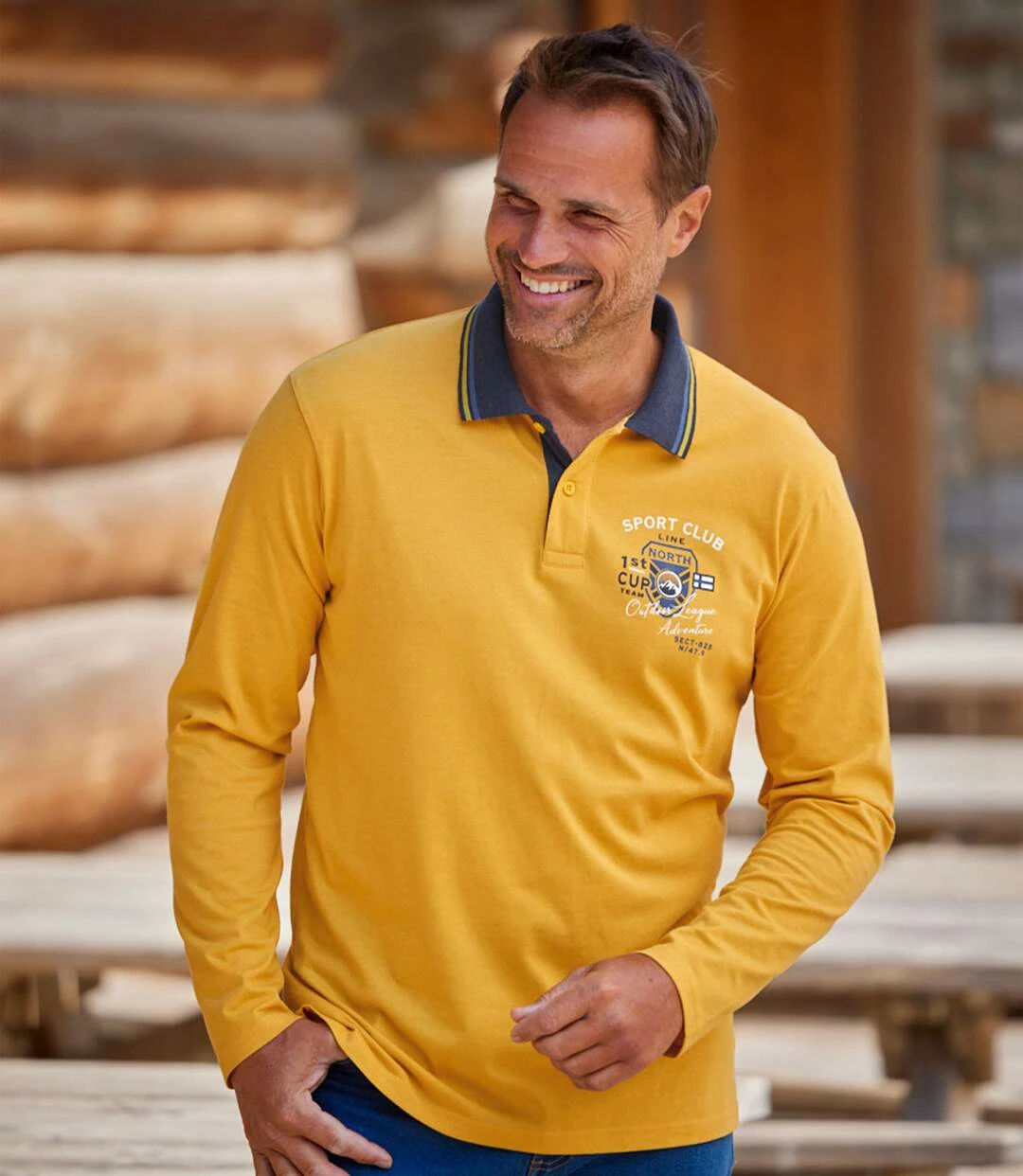 2er-Pack Poloshirts Sport Club: Perfekter Schnitt und sorgfältige Details – diese beiden langärmeligen Poloshirts aus weichem und bequemem Jersey (ca. 180 g/m²) überzeugen auf der ganzen Linie! Die Modelle ziert ein modischer Brustaufdruck. Der Polokragen in Kontrastfarbe ist mit zwei schmalen Dekorstreifen akzentuiert. Knopfleiste mit 2 Knöpfen Ton in Ton, Unterseite der Knopfleiste in Kontrastfarbe. Saum mit Seitenschlitzen für mehr Komfort. Verarbeitung mit Doppelnähten. Rückenlänge bei Größe L: ca. 74 cm. Maschinenwaschbar bei 30°. Farben: 1 x Blau, 1 x Gelb.