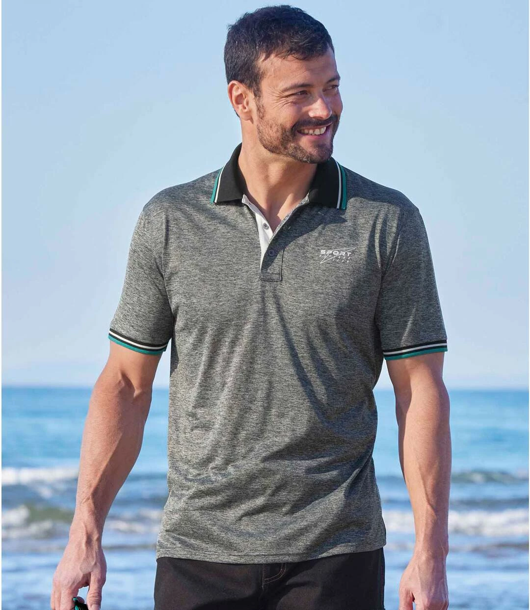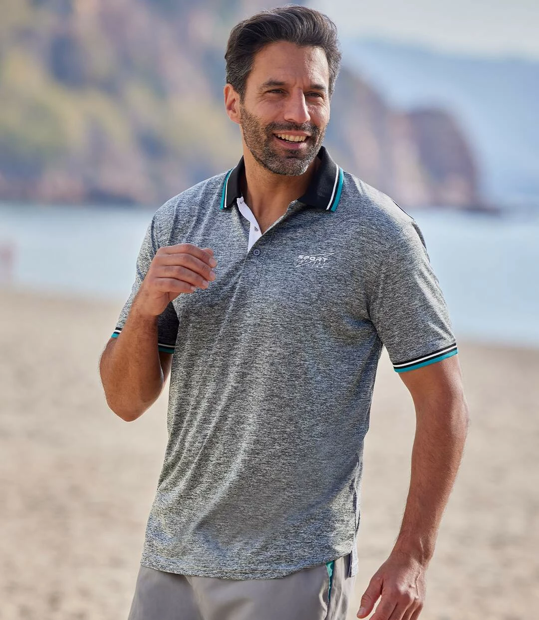 2er-Pack Poloshirts Sport Outdoor in geflammter Optik: Die beiden kurzärmeligen Poloshirts aus Jersey in geflammter Optik (ca. 130 g/m²) sind wie gemacht für den Sommer, denn sie sind fließend leicht und trocknen sehr schnell! Auf der Brust tragen sie einen kleinen Aufdruck. Den feinen Unterschied machen die Zierstreifen in Kontrastfarbe an den Rippbündchen des Kragens und der Ärmel. Die Unterseite der Knopfleiste sowie die Seitenschlitze sind ebenfalls kontrastierend abgesetzt. Verarbeitung mit Doppelnähten. 100% Polyester. Rückenlänge bei Größe L: ca. 74 cm. Maschinenwaschbar bei 30°. Bügelfrei. Farben: 1 x Grau, 1 x Smaragdgrün – Art.-Nr.: K2118