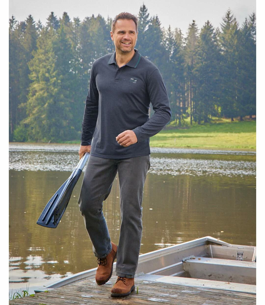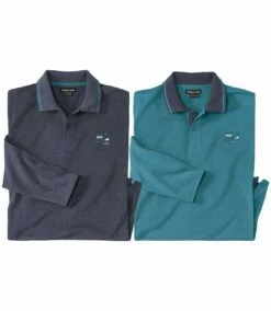 2er-Pack Poloshirts Winter Valley: Genießen Sie den sportlichen Chic dieser beiden langärmeligen Poloshirts aus weichem und anschmiegsamem Jersey (ca. 180 g/m²). Die Modelle begeistern mit perfekter Passform und dezenten Kontrastdetails: Dekorstreifen am Kragen, Brustaufdruck. Weiter Schnitt, Knopfleiste mit 2 Knöpfen. Verarbeitung mit Doppelnähten. Verstärkte Seitenschlitze. Rückenlänge bei Größe L: ca. 74 cm. Maschinenwaschbar bei 30°. Farben: 1 x Blau, 1 x Dunkelblau.