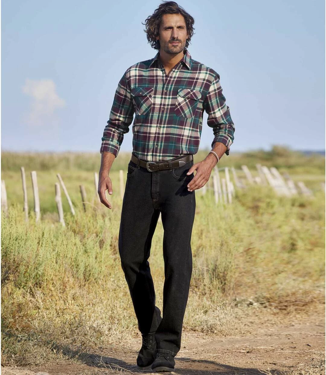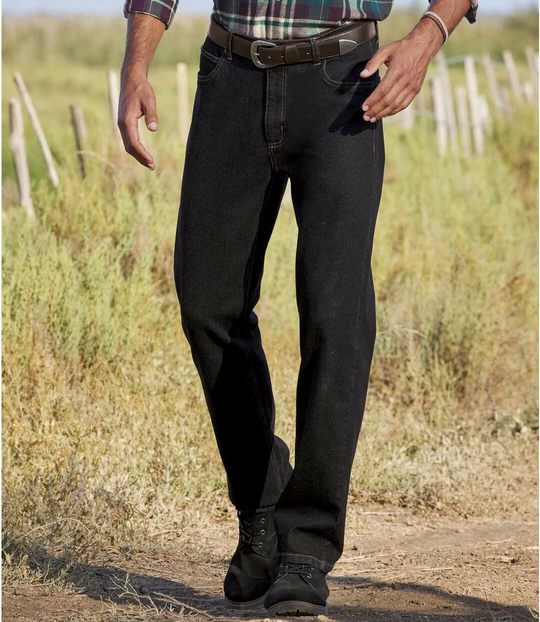2er-Pack Regular-Stretch-Jeans in Blau und Schwarz: Diese beiden Jeans sind wie gemacht fürs Abenteuer! Der solide Denim (11 oz) ist strapazierfähig und superbequem zugleich. Eine Jeans wie diese gehört in jeder Jahreszeit zum Standard-Outfit. Einwandfreie Verarbeitung: Bund mit Schlaufen, verdeckter Reißverschluss mit Metallknopf, 2 Einstecktaschen mit Nieten und 1 Münztasche vorne und 2 aufgesetzte Gesäßtaschen. Kontrastnähte, Badge am Bund. Schrittlänge bei Größe 50: ca. 86 cm, Fußweite: ca. 21,5 cm. Maschinenwaschbar bei 30°. Farben: 1 x Schwarz, 1 x Blau.