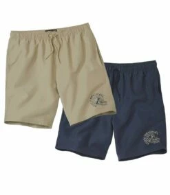 2er-Pack Shorts Tropical Surf aus Microfaser: Ob für den Strand, den Sport oder das entspannte Wochenende, diese 2 Shorts aus Microfaser (ca. 110 g/m²) werden Ihnen gefallen! Das leichte und bequeme Material trocknet sehr schnell! Die Shorts haben einen Elastikbund mit Tunnelzug inkl. außenliegender Verstellkordel. 2 praktische Seitentaschen. Exklusiver Beinaufdruck. Angedeuteter Eingriff. 100% Polyester. Schrittlänge bei Größe L: ca. 20 cm, Beinweite: ca. 29 cm. Maschinenwaschbar bei 30°. Bügelfrei. Farben: 1 x Dunkelblau, 1 x Beige – Art.-Nr.: G0140