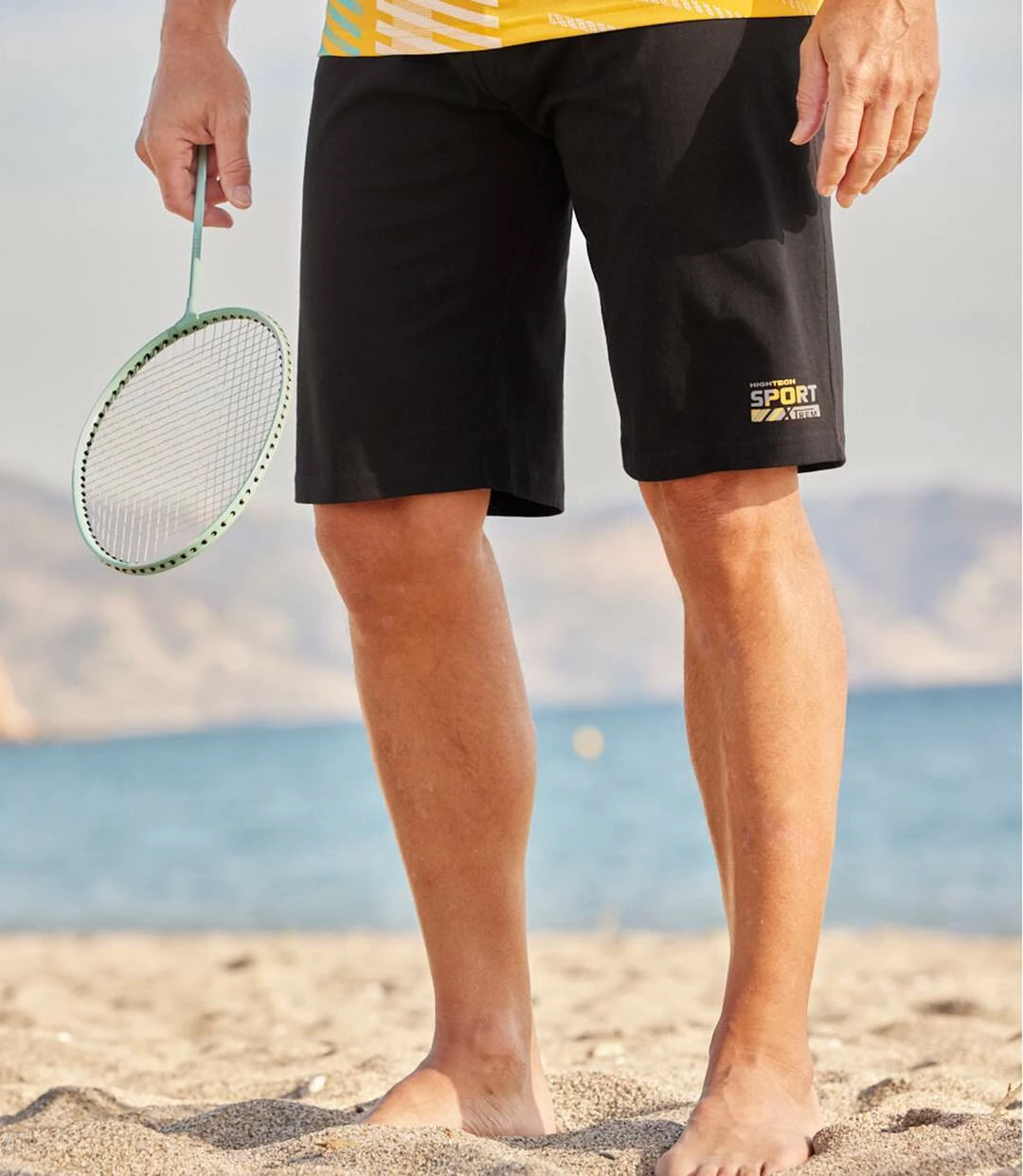 2er-Pack sportliche Bermudas: Egal ob Sie sportlich aktiv sind oder einfach mal nur entspannen, diese beiden Bermudas aus leichter, weicher und anschmiegsamer Baumwolle (ca. 160 g/m²) sind ideal für unbeschwerte Sommertage! 2 Seitentaschen. Der Elastikbund mit außenliegender Verstellkordel bietet Top-Komfort. Der Saum ist mit Doppelnähten verarbeitet. Kleiner Aufdruck auf dem linken Oberschenkel. 100% Baumwolle. Schrittlänge bei Größe L: ca. 30 cm, Beinweite: ca. 28 cm. Maschinenwaschbar bei 30°. Farben: 1 x Schwarz, 1 x Türkis – Art.-Nr.: K1156