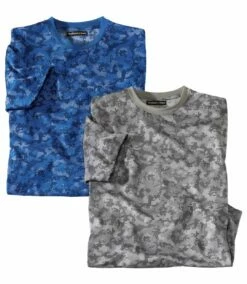 2er-Pack T-Shirts Camouflage: Camouflage-Prints liegen nach wie vor im Trend, hier kommen 2 T-Shirts mit diesem typischen Abenteurer-Design in unterschiedlichen Farbvarianten! Die T-Shirts werden aus fließend leichtem und knitterfreien Stoff (ca. 140 g/m²) gefertigt, der schnell trocknet und bügelfrei ist. Da sollten Sie sofort zugreifen. Rundhals mit Rippbündchen. Kurze Ärmel und Saum mit Doppelnähten. 100% Polyester. Rückenlänge bei Größe L: ca. 74 cm. Maschinenwaschbar bei 30°. Farben: 1 x Blau, 1 x Grau – Art.-Nr.: J1137