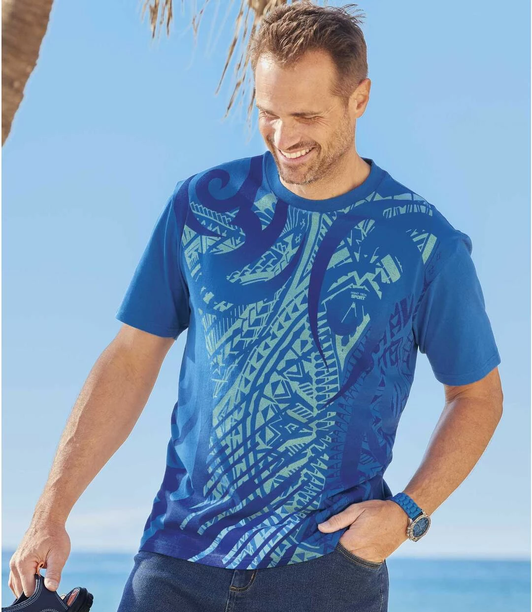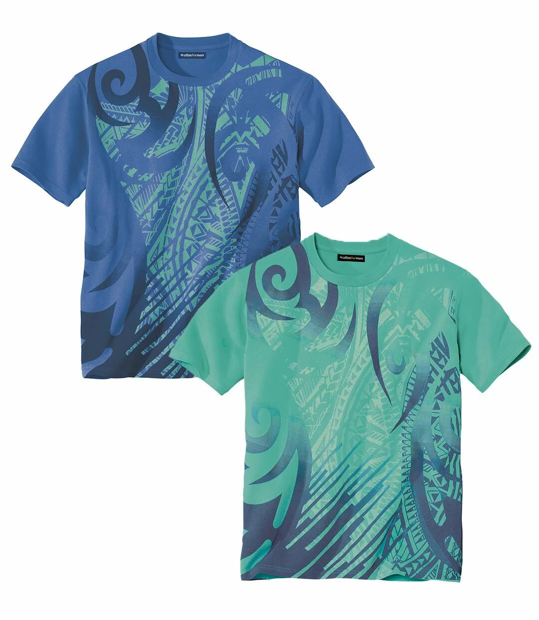 „2er-Pack T-Shirts mit Brustaufdruck:“ Die großen Brustaufdrucke im Stil der Ureinwohner Neuseelands wecken die Reiselust! Dank der weichen und anschmiegsamen Baumwolle (ca. 145 g / m²) tragen sich diese beiden Modelle sehr angenehm. Hochwertige Verarbeitung mit Rundhalsausschnitt inkl. Rippbündchen, Nackenband und Doppelnähten an Saum und Ärmeln. Einfarbiger Rücken. 60% Baumwolle, 40% Polyester. Rückenlänge bei Größe L: ca. 74 cm. Maschinenwaschbar bei 30°. Auf Links bügeln wegen des Aufdrucks. Farben: 1 x Blau, 1 x Türkis, Art.-Nr.: K0151
