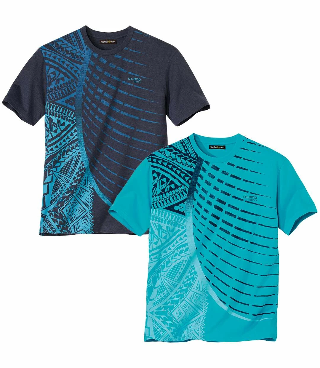 2er-Pack T-Shirts mit Druckmotiv: Die großen Druckmotive im Stil der Maori sehen einfach klasse aus und machen Lust auf eine Entdeckungstour! Die T-Shirts werden aus weichem, anschmiegsamem Jersey (ca. 145 g/m²) gefertigt und haben einen Rundhals mit Rippbündchen. Kurze Ärmel und Saum mit Doppelnähten. Einfarbiger Rücken. 60% Baumwolle, 40% Polyester. Rückenlänge bei Größe L: ca. 74 cm. Maschinenwaschbar bei 30°. Auf Links bügeln wegen des Aufdrucks. Farben: 1 x Türkis, 1 x Dunkelblau – Art.-Nr.: H5161