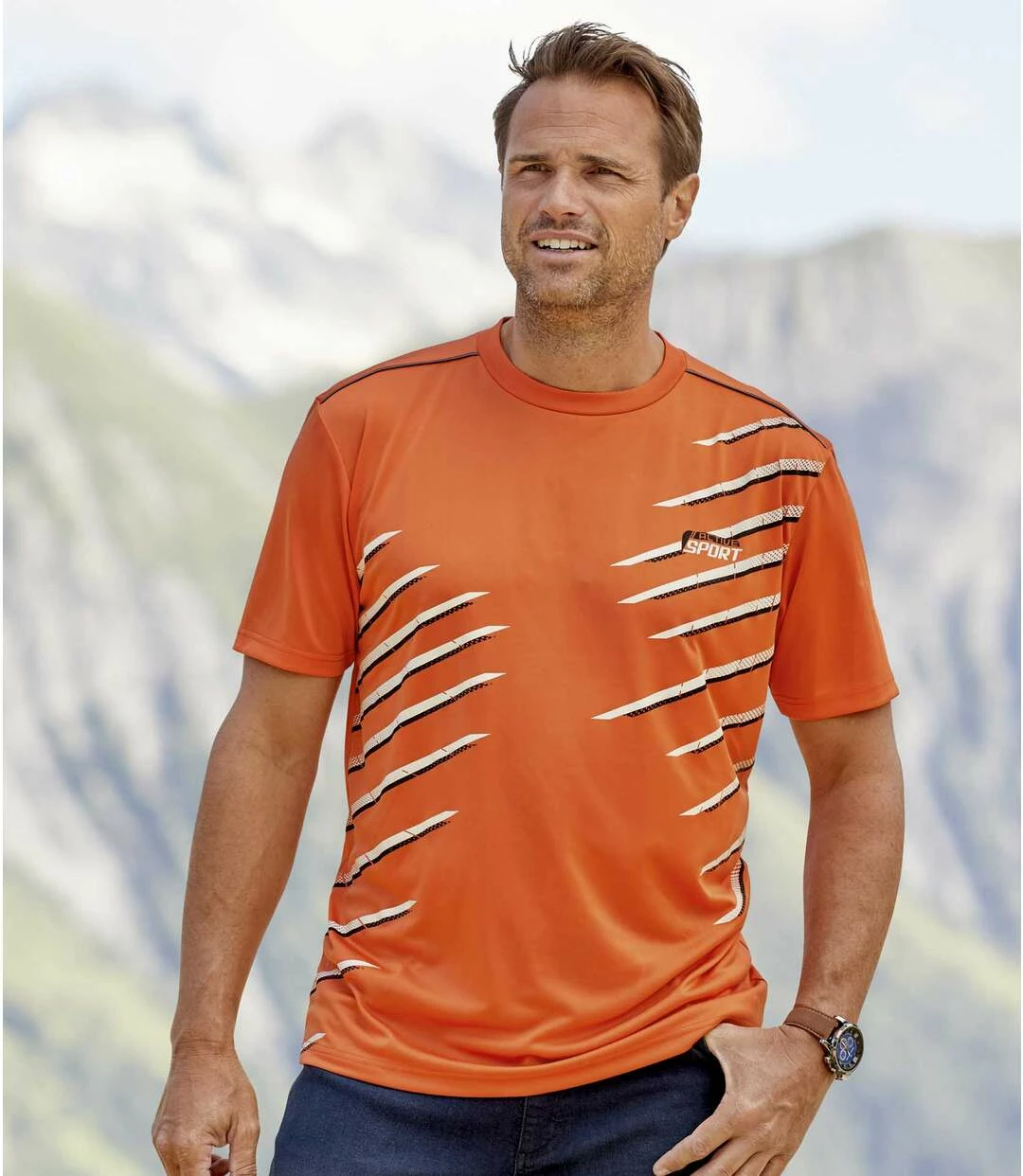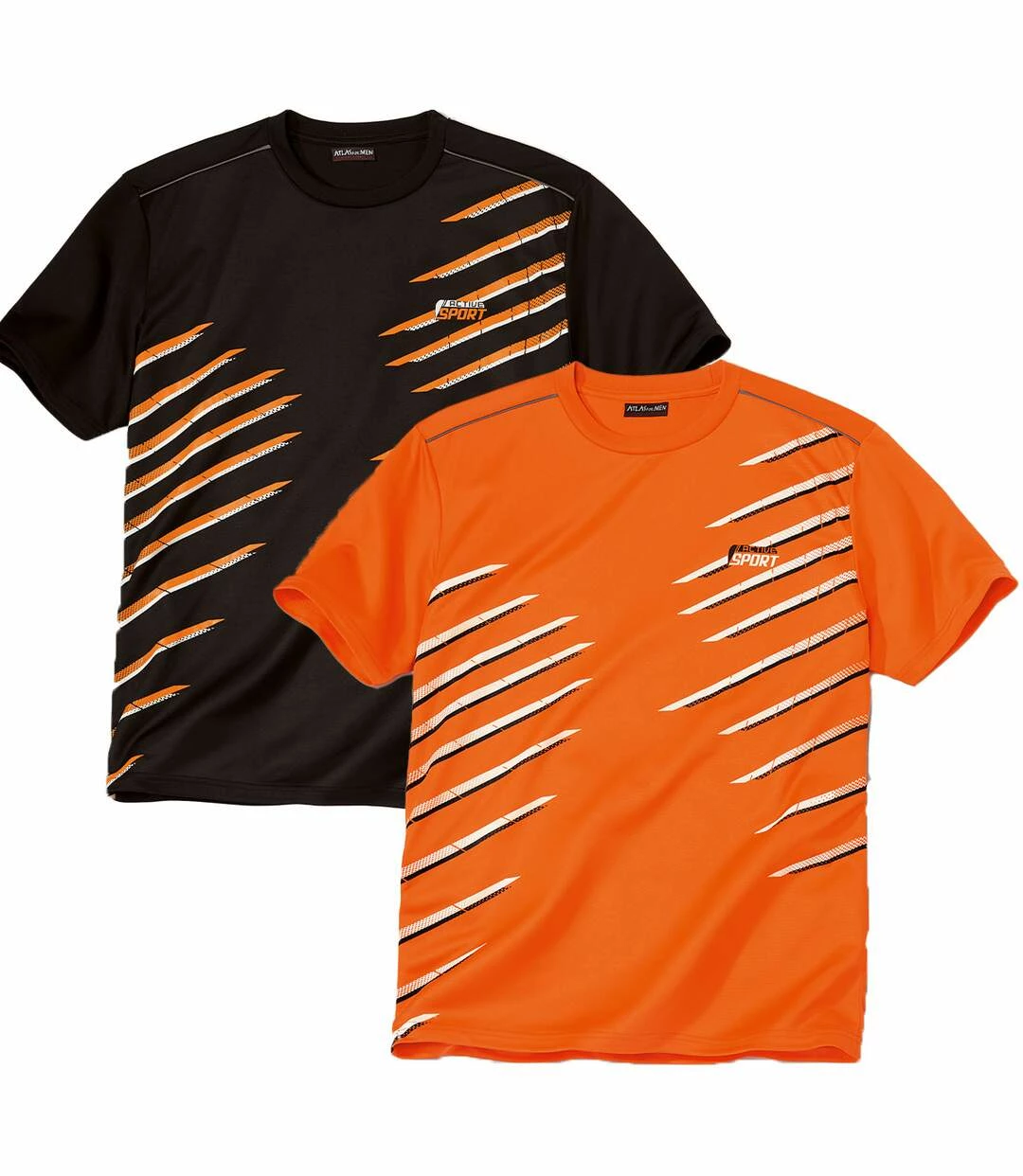 2er-Pack T-Shirts mit Grafikmotiv: T-Shirts braucht man in jeder Jahreszeit. Diese Modelle tragen sich sehr angenehm und überzeugen außerdem mit ihrem dynamischen Design mit Grafikmotiv. Der fließende und knitterfreie Jersey (ca. 160 g/m²) ist sehr pflegeleicht, schnell trocknend und bügelfrei. Gönnen Sie sich diese super bequemen, unverzichtbaren Basics für den Sport! Sehr sorgfältige Verarbeitung: Rundhals mit Rippbündchen, Schulterpassen mit Kontrastpaspel, Ärmel und Saum mit Doppelnähten. 100% Polyester. Rückenlänge bei Größe L: ca. 74 cm. Maschinenwaschbar bei 30°. Farben: 1 x Schwarz, 1 x Orange / Art.-Nr.: F4177