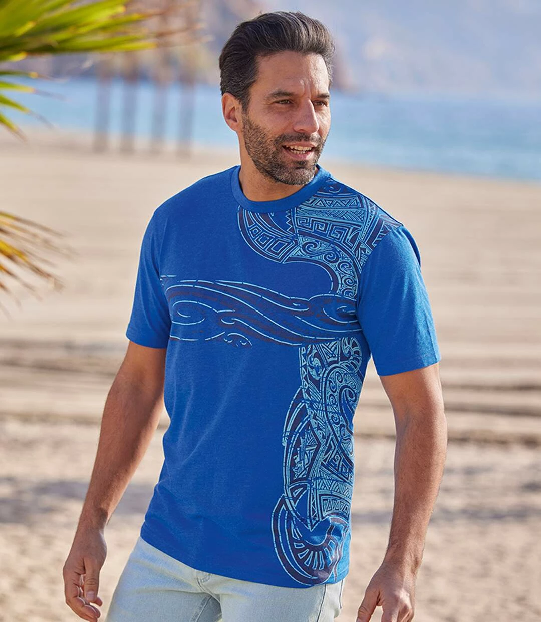 2er-Pack T-Shirts mit graphischen Motiven: Für diese beiden kurzärmeligen T-Shirts haben sich unsere Designer von den graphischen Motiven der Maori-Kunst und dem sagenhaften Blau des Pazifiks inspirieren lassen! Der hochwertige Jersey (ca. 145 g/m²) ist weich, bequem und anschmiegsam. Sorgfältige Verarbeitung: Rundhals mit Rippbündchen, Einfassband im Nacken, Ärmel und Saum mit Doppelnähten. 60% Baumwolle, 40% Polyester. Rückenlänge bei Größe L: ca. 74 cm. Maschinenwaschbar bei 30°. Auf Links bügeln wegen des Aufdrucks. Farben: 1 x Himmelblau, 1 x Blau – Art.-Nr.: G0160