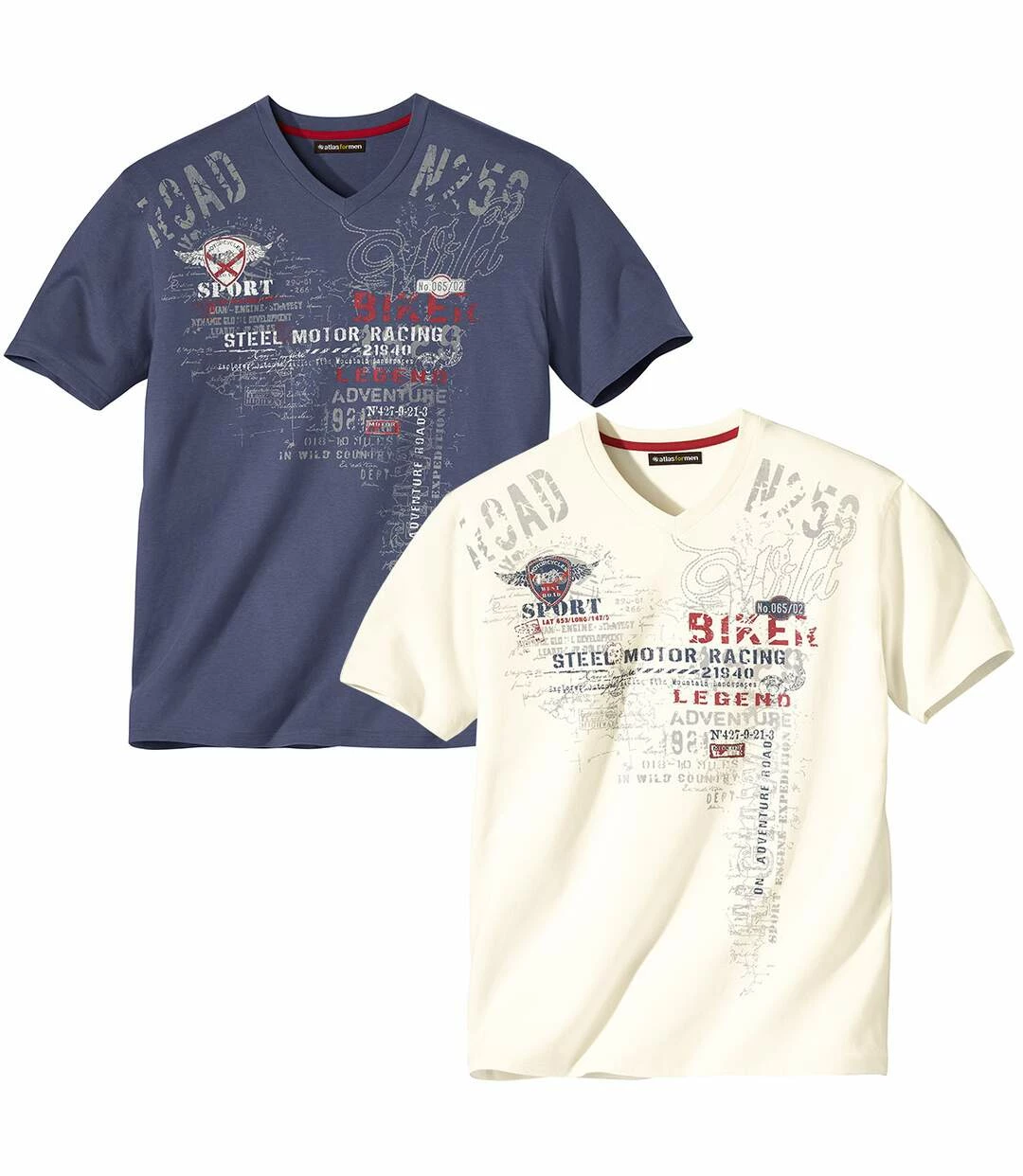 „2er-Pack T-Shirts mit großem Aufdruck:“ Der große Aufdruck dieser T-Shirts ist wie eine Abenteuer-Route für Motorrad-Fans! Diese tragefreundlichen Modelle aus weichem Baumwollmix (ca. 145 g / m²) haben einen V-Ausschnitt mit Rippbündchen, kurze Ärmel und einen geraden Saum mit Doppelnähten. 60% Baumwolle, 40% Polyester. Rückenlänge bei Größe L: ca. 74 cm. Maschinenwaschbar bei 30°. Auf Links bügeln wegen des Aufdrucks. Farben: 1 x Naturfarben, 1 x Indigo, Art.Nr.: J7151