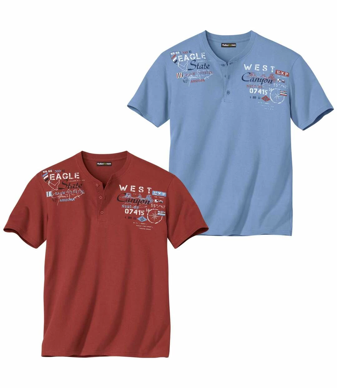 2er-Pack T-Shirts mit Henleykragen Evasion: Die auffälligen Aufdrucke auf diesen Henleyshirts sind für unternehmungslustige Männer wie eine Aufforderung zu einer Reise. Die Shirts aus reiner und weicher Baumwolle (ca. 160 g/m²) sind superbequem. Rundhalsausschnitt mit Knopfleiste inkl. 3 Knöpfen Ton in Ton. Den Ausschnitt können Sie zugeknöpft oder offen tragen. Kurze Ärmel und Saum mit Doppelnähten. 100% Baumwolle. Rückenlänge bei Größe L: ca. 74 cm. Maschinenwaschbar bei 30°. Auf Links bügeln wegen des Aufdrucks. Farben: 1 x Ziegelrot, 1 x Blau – Art.-Nr.: L3118