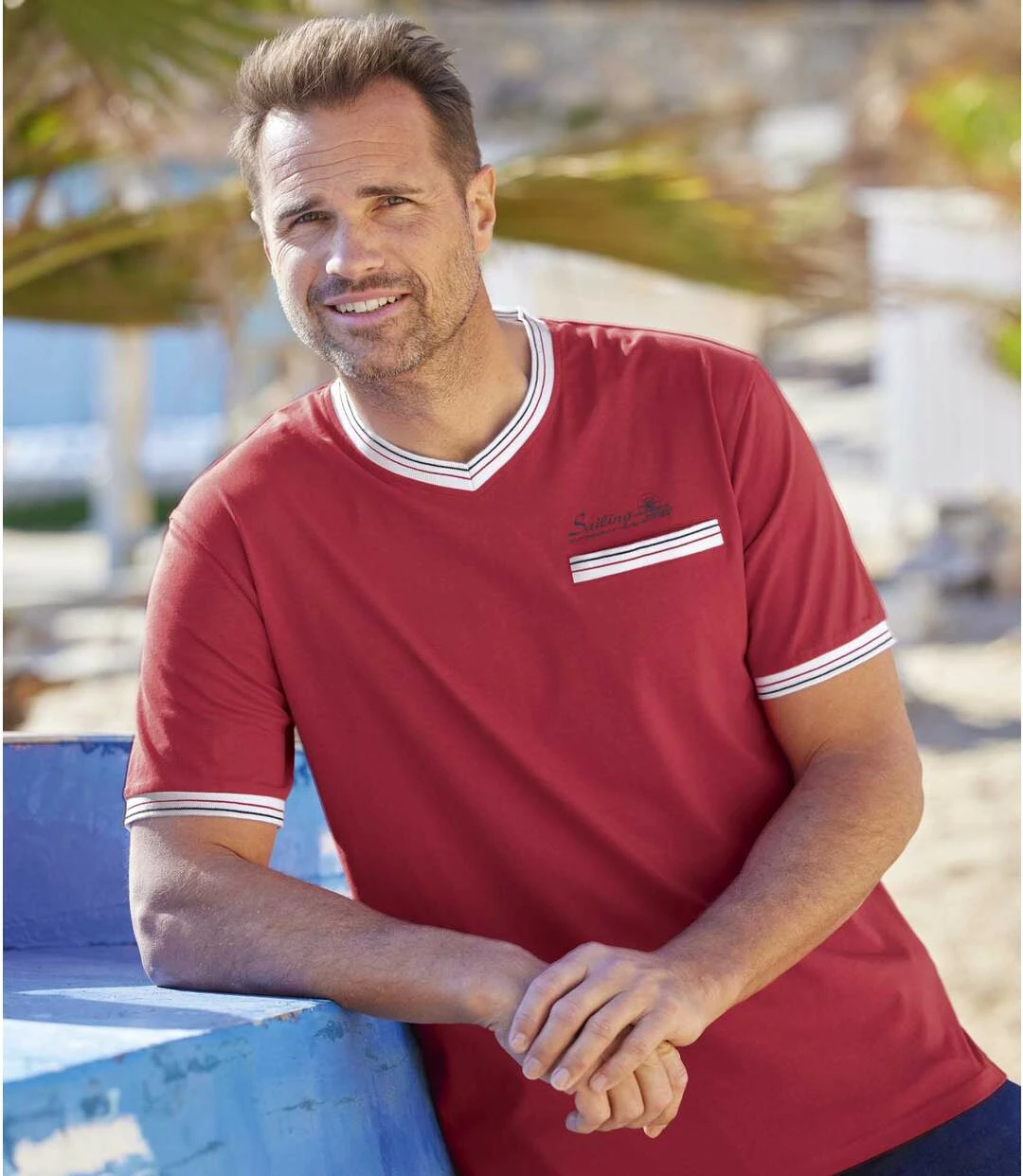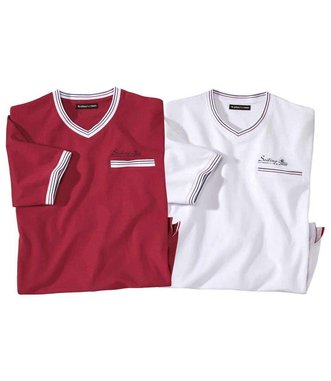 2er-Pack T-Shirts Palma mit V-Ausschnitt: Greifen Sie zu diesen beiden T-Shirts! Sie sind einfach, aber chic und vor allem bequem, das garantiert die weiche und anschmiegsame Baumwolle (ca. 160 g/m²). Optisch unterscheiden sie sich von der Masse durch den Brustaufdruck Sailing und die gedoppelten, dünn gestreiften Rippbündchen am V-Ausschnitt, an den Ärmeln und an der angedeuteten Brusttasche. Gerader Saum mit Doppelnaht. Die Seitenschlitze sind mit Ripsband in Kontrastfarbe verstärkt. 100% Baumwolle. Rückenlänge bei Größe L: ca. 74 cm. Maschinenwaschbar bei 30°. Farben: 1 x Weiß, 1 x Rot – Art.-Nr.: K1146
