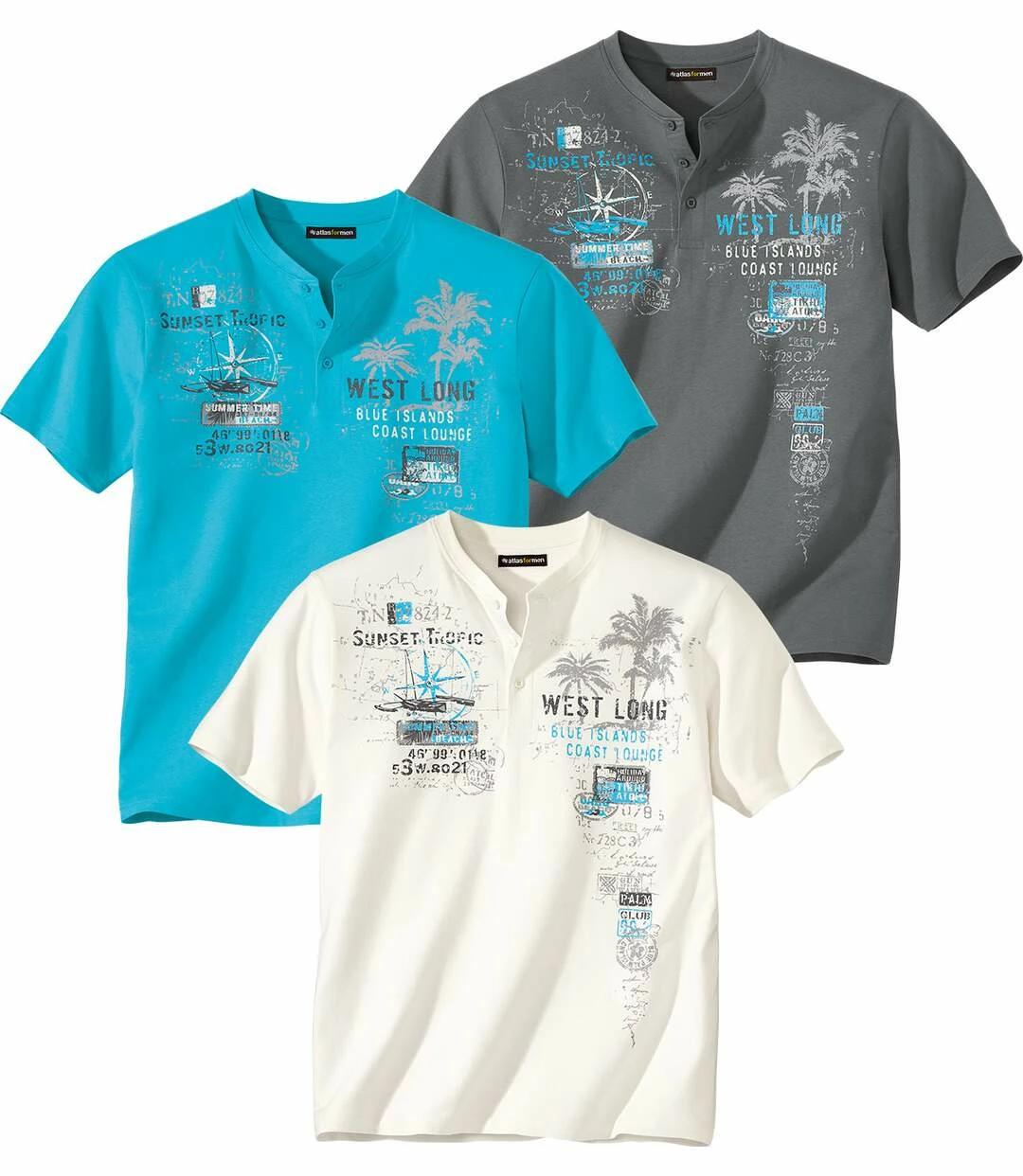 3er-Pack bequeme Henleyshirts: Die 2 exklusiven Aufdrucke auf diesen T-Shirts machen richtig Lust auf einen Urlaub auf einer Mittelmeerinsel. Die Modelle werden aus weichem und anschmiegsamem Jersey (ca. 160 g/m²) gefertigt. Einwandfreier Schnitt: Rundhalsausschnitt mit Rippbündchen, Knopfleiste mit 3 Knöpfen Ton in Ton. Kurze Ärmel und Saum mit Doppelnähten. 60% Baumwolle, 40% Polyester. Rückenlänge bei Größe L: ca. 74 cm. Maschinenwaschbar bei 30°. Auf Links bügeln wegen des Aufdrucks. Farben: 1 x Natur, 1 x Anthrazit,1 x Türkis – Art.-Nr.: K1165