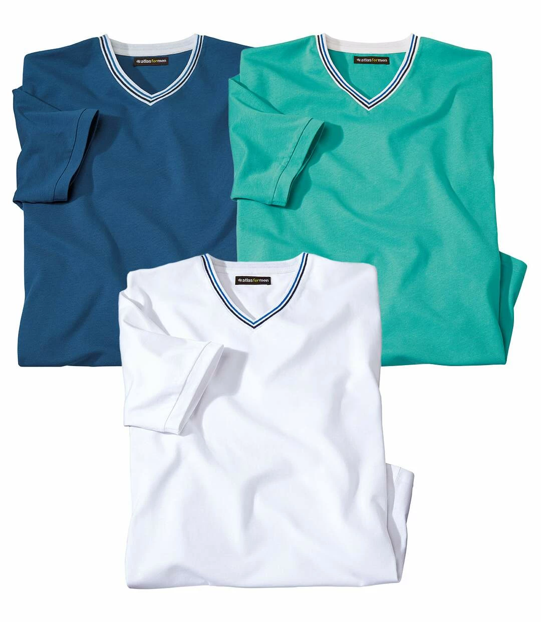 „3er-Pack einfarbige T-Shirts mit V-Ausschnitt:“ Hier kommen 3 T-Shirts in sommerlich leuchtenden Farben! Der kleine aber feine Unterschied: Die weißen Rippbündchen des V-Ausschnitts sind hell- und dunkelblau gestreift. Dank derm weichen Baumwollmix (ca. 145 g / m²) tragen sich die T-Shirts sehr angenehm. Kurze Ärmel und Saum mit Doppelnähten. 60% Baumwolle, 40% Polyester. Rückenlänge bei Größe L: ca. 74 cm. Maschinenwaschbar bei 30°. Farben: 1 x Weiß, 1 x Türkis, 1 x Blau, Art.Nr.: G1166