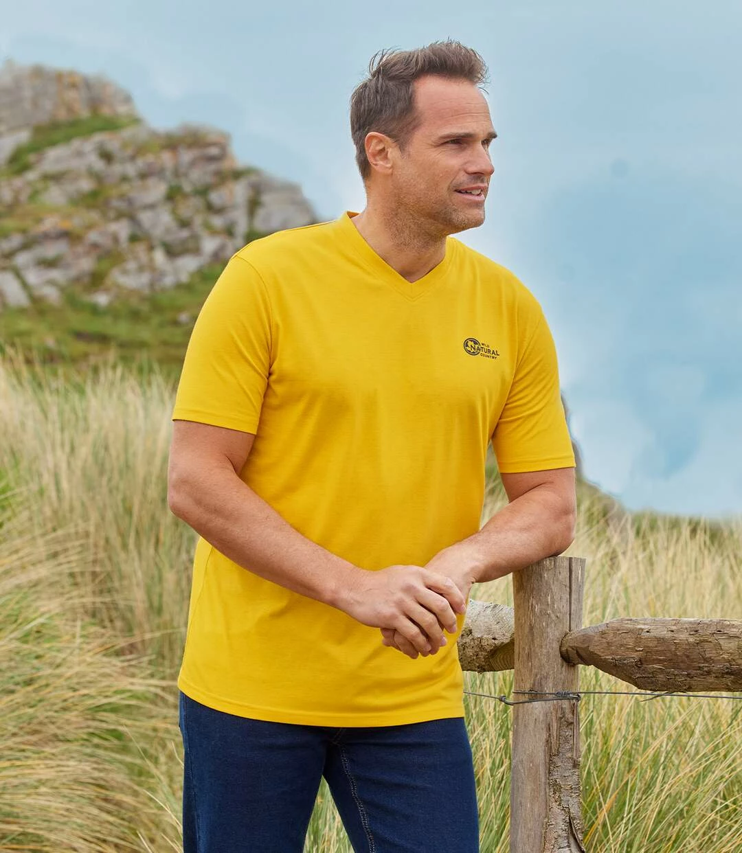 3er-Pack einfarbige T-Shirts: Diese 3 T-Shirts aus sanftem und weichem Jersey (ca. 145 g/m²) verwöhnen mit Top-Komfort! Modische Akzente setzt der Brustaufdruck. Schöne Verarbeitung: V-Ausschnitt, kurze Ärmel und gerader Saum mit Doppelnähten. 60% Baumwolle, 40% Polyester. Rückenlänge bei Größe L: ca. 74 cm. Maschinenwaschbar bei 30°. Farben: 1 x Gelb, 1 x Türkis, 1 x Dunkelblau – Art.-Nr.: J7156
