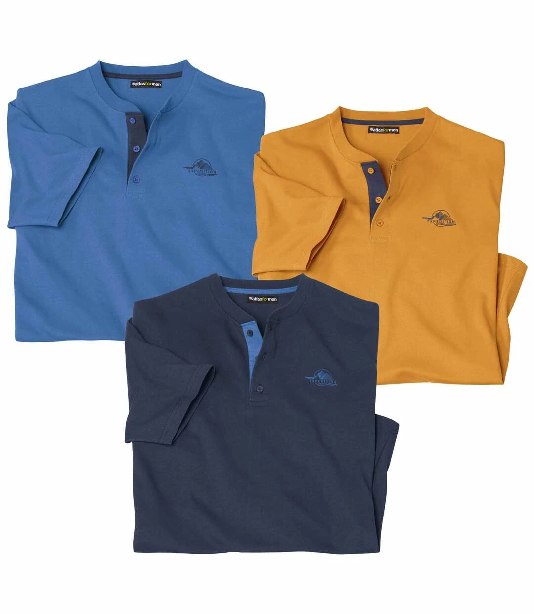 3er-Pack Henleyshirts Colorado: Genießen Sie den lässigen Look dieser 3 kurzärmeligen Henleyshirts! Kontrastdetails sorgen für den modischen Touch: kleiner Brustaufdruck und kontrastierend unterlegte Knopfleiste. Den Rundhalsausschnitt mit Rippbündchen und Knöpfen Ton in Ton können Sie offen oder zugeknöpft tragen. Ärmel und Saum sind mit Doppelnähten verarbeitet. 100% Baumwolle. Rückenlänge bei Größe L: ca. 74 cm. Maschinenwaschbar bei 30°. Farben: 1 x Dunkelblau,1 x Blau, 1 x Gelb – Art.-Nr.: L1119