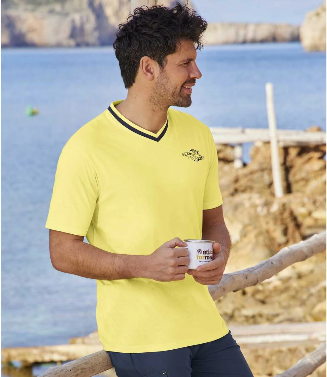 3er-Pack T-Shirts Team Surf mit V-Ausschnitt: Freuen Sie sich auf diese 3 T-Shirts aus sanftem und anschmiegsamem Jersey (ca. 145 g/m²) in sommerlichen Farbtönen! Für einen dezenten modischen Akzent sorgt der V-Ausschnitt mit zweifarbigen Rippbündchen. Weiter und bequemer Schnitt, Verarbeitung mit Doppelnähten. Kleiner Brustaufdruck. Rückenlänge bei Größe L: ca. 74 cm. Maschinenwaschbar bei 30°. Farben: 1 x Weiß,1 x Dunkelblau, 1 x Gelb.