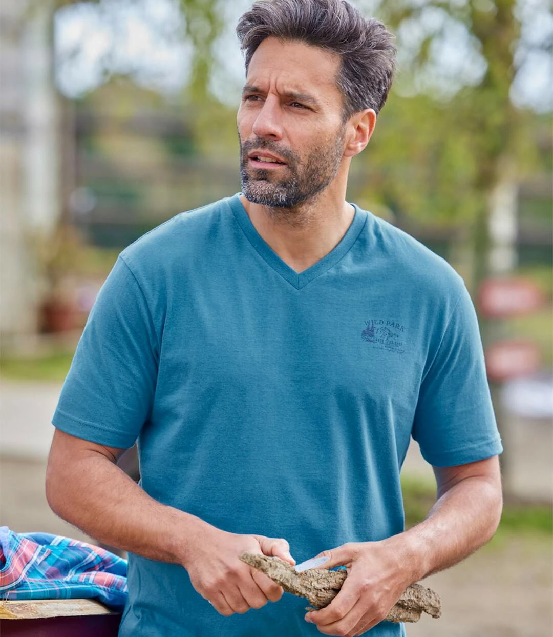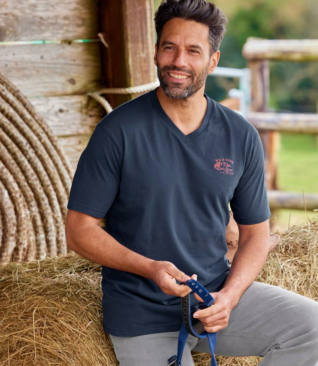 4er-Pack T-Shirts Wild Park: Mit diesem 4er-Pack T-Shirts aus weicher Baumwolle (ca. 160 g/m²) haben Sie immer ein Modell in der passenden Farbe! Perfekte Verarbeitung mit V-Ausschnitt inkl. Rippbündchen und kleinem Brustaufdruck. Gönnen Sie sich diese bequemen Basic-Shirts, die man immer gebrauchen kann! Kurze Ärmel und gerader Saum mit Doppelnähten. 100% Baumwolle. Rückenlänge bei Größe L: ca. 74 cm. Maschinenwaschbar bei 30°. Farben: 1 x Dunkelblau, 1 x Korallenrot, 1 x Blau, 1 x Natur – Art.-Nr.: K5115