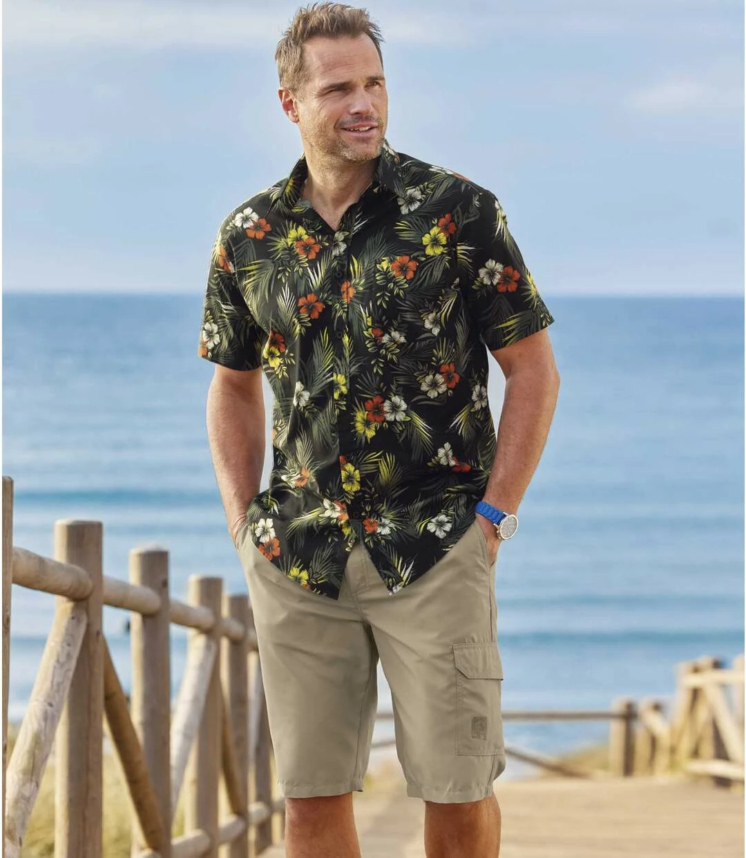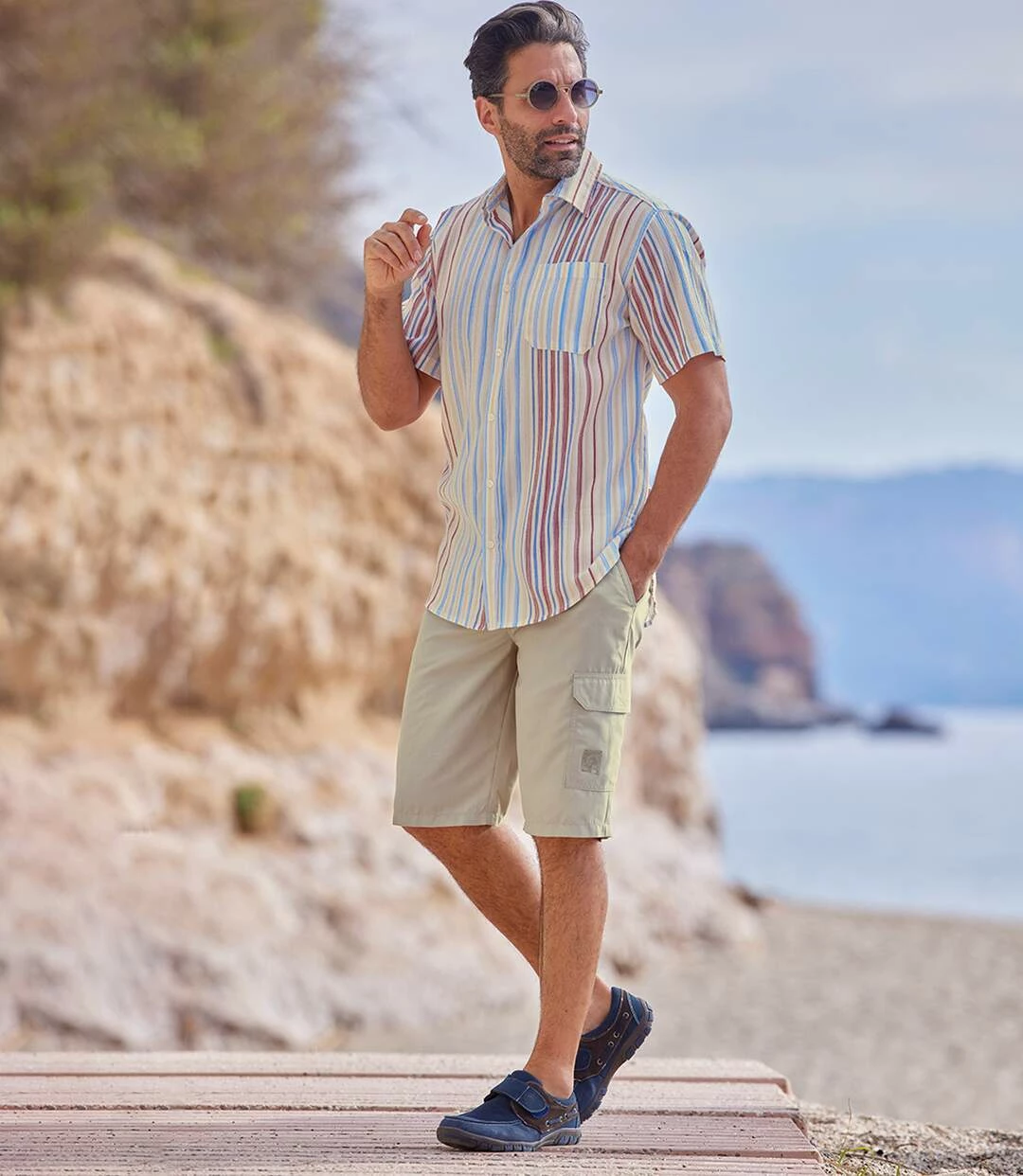 Beige Cargo-Bermuda aus Microfaser: Für den Urlaub empfehlen wir Ihnen diese extrem leichte Bermuda aus Microfaser (ca. 110 g / m²). Ihren Tragekomfort verdankt sie dem teilelastischen Bund, der mit einem Reißverschluss und einem beigen Knopf verschlossen wird. Die Bermuda hat 4 Taschen: 2 Einstecktaschen vorne, 1 paspelierte Gesässtasche mit Klettverschluss und 1 Cargo-Tasche mit Klettklappe (mit kleinem exklusiven Aufdruck). 100% Polyester. Schrittlänge bei Größe L: ca. 30 cm, Beinweite: ca. 26 cm. Maschinenwaschbar bei 30°. Bügelfrei. Farbe: Beige. Art.-Nr.: L5149