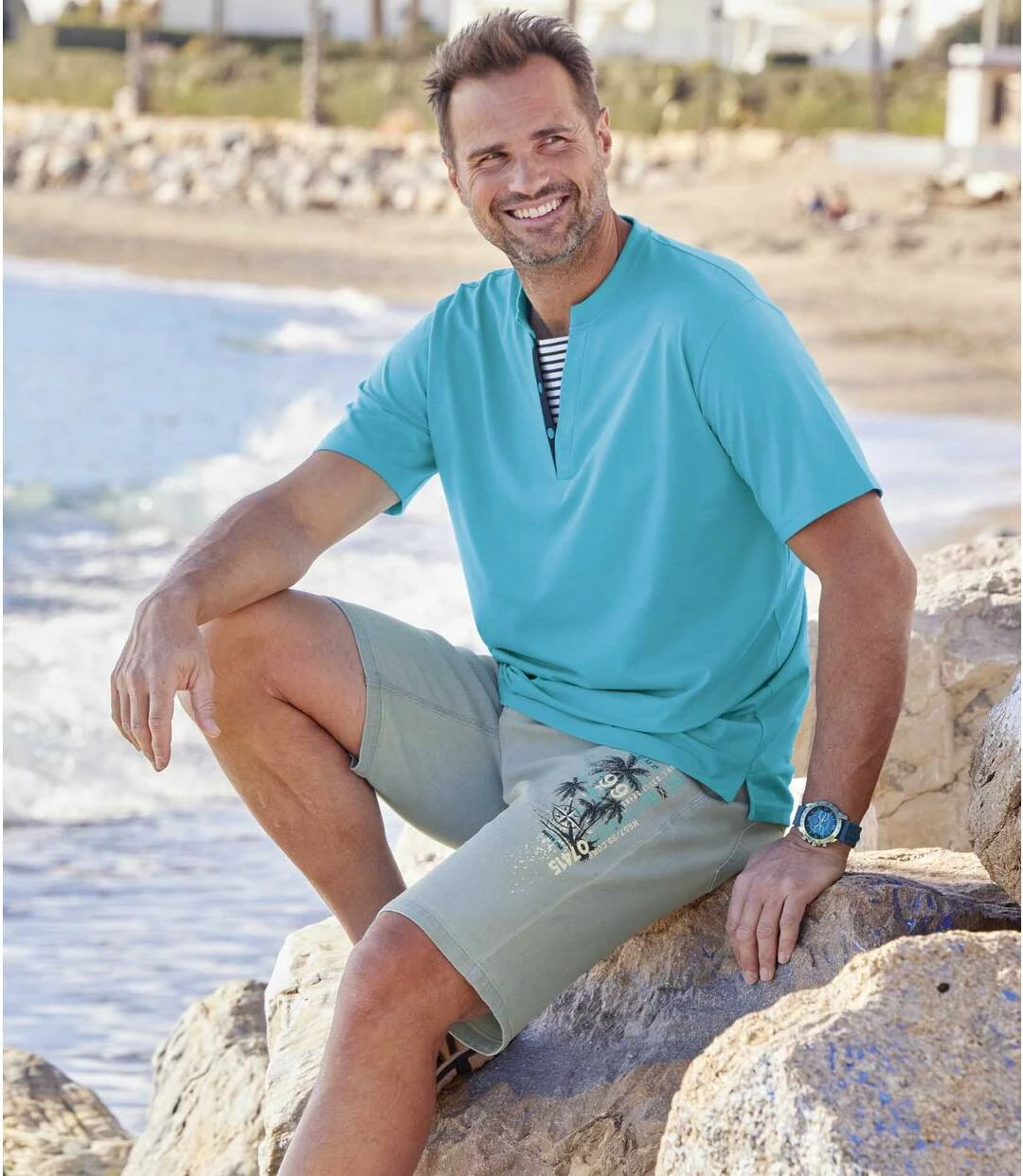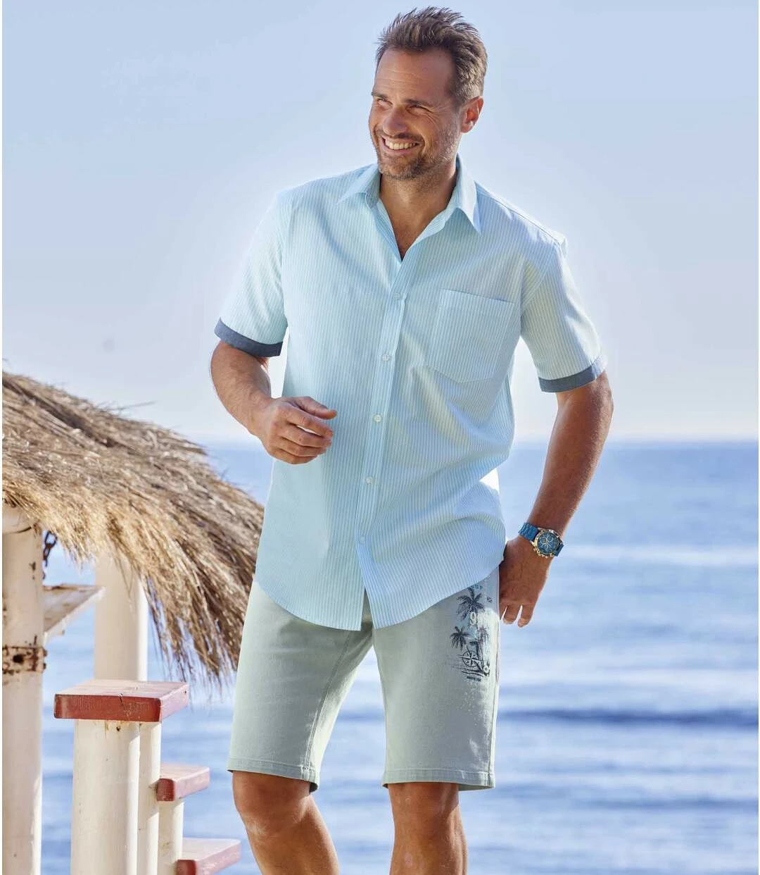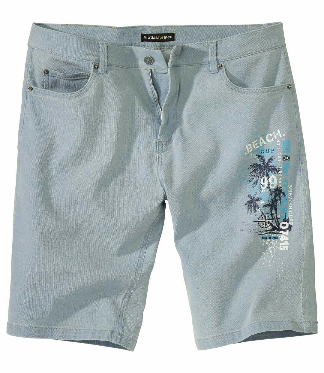 Bermuda Beach Club aus Stretch-Denim: Diese tolle Bermuda wird Sie durch den Sommer begleiten, denn der leicht dehnbare Denim (9,5 oz) ist superbequem! Der besondere Unterschied: großer Aufdruck mit einem sommerlichen Palmenmotiv auf dem linken Oberschenkel. Perfekter Schnitt mit 5 Taschen: 2 Einstecktaschen und 1 Münztasche mit Nieten vorne und 2 aufgesetzte Gesäßtaschen. Bund mit Schlaufen, verdeckter RV inkl. Abschlussknopf aus Metall. 98% Baumwolle, 2% Elasthan. Schrittlänge bei Größe 50: ca. 30 cm, Beinweite: ca. 26 cm. Maschinenwaschbar bei 30°. Auf Links bügeln wegen des Aufdrucks. Farbe: Hellblau – Art.-Nr.: K0115