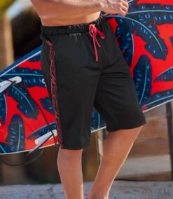 Bermuda Sport und Freizeit: Diese universelle Bermuda bietet Ihnen tollen Tragekomfort beim Sport und in der Freizeit! Der weiche und unkomplizierte Stoff (ca. 190 g/m²) macht alles mit. Den Elastikbund passen Sie mit der Verstellkordel individuell an. Lässiger Stil mit 2 seitlichen Kontrastbändern. Saum mit Doppelnähten. 100% Polyester. Schrittlänge bei Größe L: ca. 30 cm, Beinweite: ca. 28 cm. Maschinenwaschbar bei 30°. Schnell trocknend. Bügelfrei. Farbe: Schwarz.
