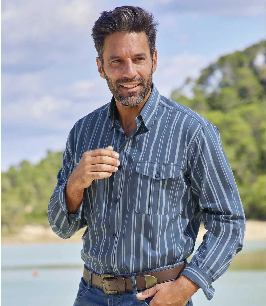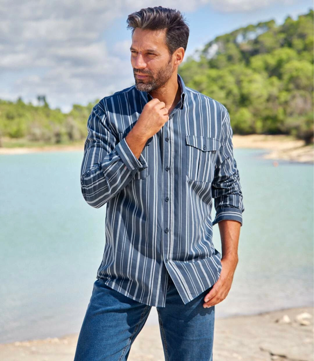 Blau gestreiftes Popelin-Hemd: Die Längsstreifen dieses Hemds lassen Ihre Silhouette schmaler wirken! Gefertigt wird dieses Modell aus weichem, anschmiegsamem Popelin (ca. 110 g/m²) mit Webstreifen. Es ist mit 2 geknöpften Brusttaschen ausgestattet. Klassische Verarbeitung: Kentkragen, Knopfmanschetten, 2 Bewegungsfalten im Rücken, abgerundeter Saum. Dunkelblaue Knöpfe. 100% Baumwolle. Rückenlänge bei Größe L: ca. 81 cm. Maschinenwaschbar bei 30°. Farbe: Dunkelblau gestreift – Art.-Nr.: L1138