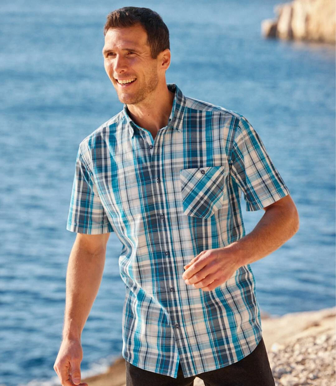 Blau kariertes Sommerhemd: Dieses kurzärmelige Hemd aus Popelin (ca. 110 g/m²) verleiht Ihren Outfits dank der leuchtend blauen Webkaros einen lässigen, frühlingshaften Touch! Seinen besonderen Chic verdankt das Modell den Revers aus einfarbig dunkelblauem Popelin, je nach Laune können Sie die Revers sichtbar tragen oder umklappen… Weiter Schnitt mit 2 Bewegungsfalten im Rücken und abgerundetem Saum. Kentkragen, Knöpfe mit Gravur. 100% Baumwolle. Rückenlänge bei Größe L: ca. 80 cm. Maschinenwaschbar bei 30°. Farbe: Blau kariert