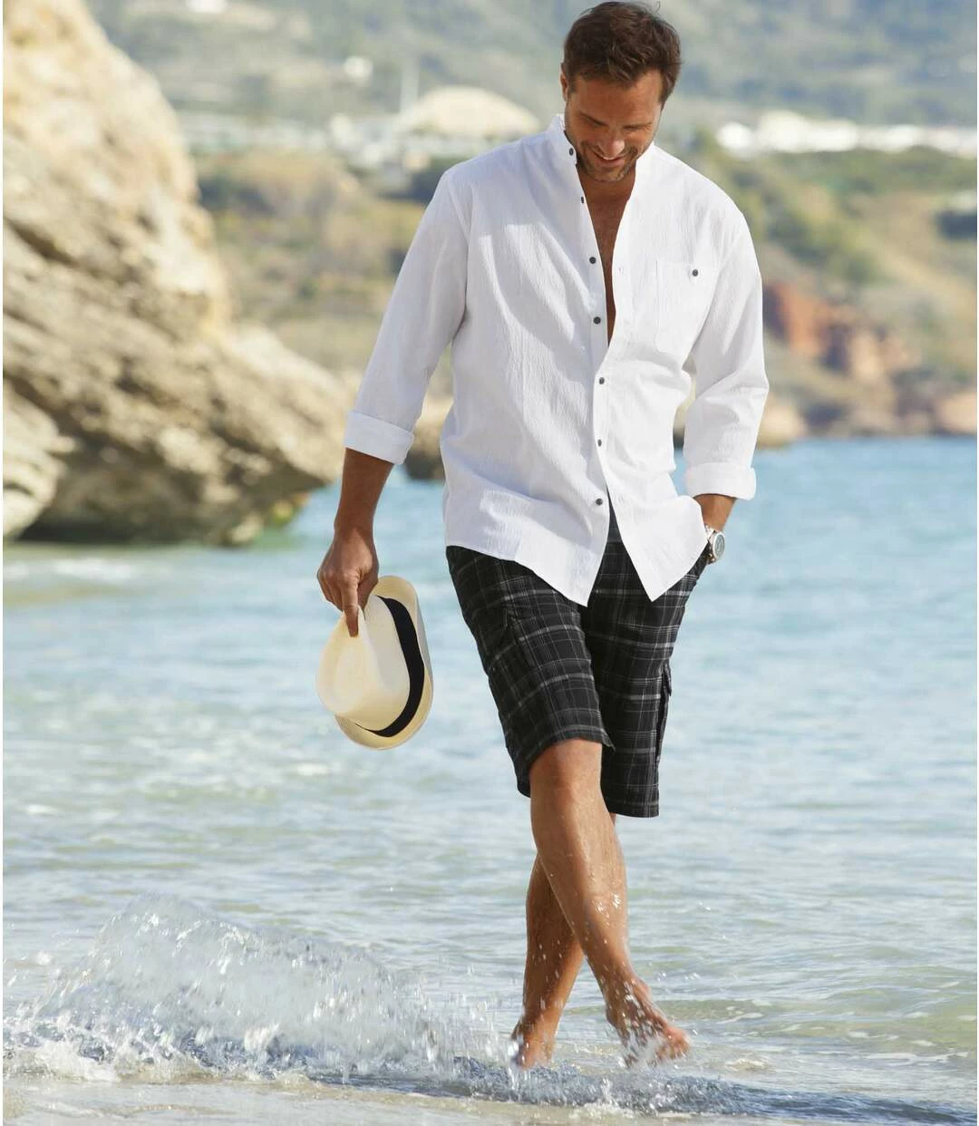 Cargo-Bermuda Urlaubsfeeling: Diese Bermuda mit aufgedrucktem Karomuster begeistert mit ihrem lässigen Chic und dem robusten Microcanvas (ca. 200 g/m²). Die Hose hat 6 praktische Taschen: 2 Einstecktaschen vorne, 2 aufgesetzte Gesäßtaschen sowie 2 seitliche Cargo-Taschen mit Klettklappen. Verarbeitung mit Doppelnähten. Die Bermuda passt ideal zu einem einfarbigen Oberteil! 100% Baumwolle. Schrittlänge bei Größe 52: ca. 32 cm, Beinweite: ca. 28 cm. Maschinenwaschbar bei 30°. Farben: Schwarz mit grauen Karos – Art.-Nr.: D1116
