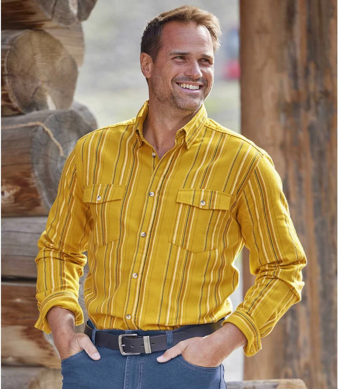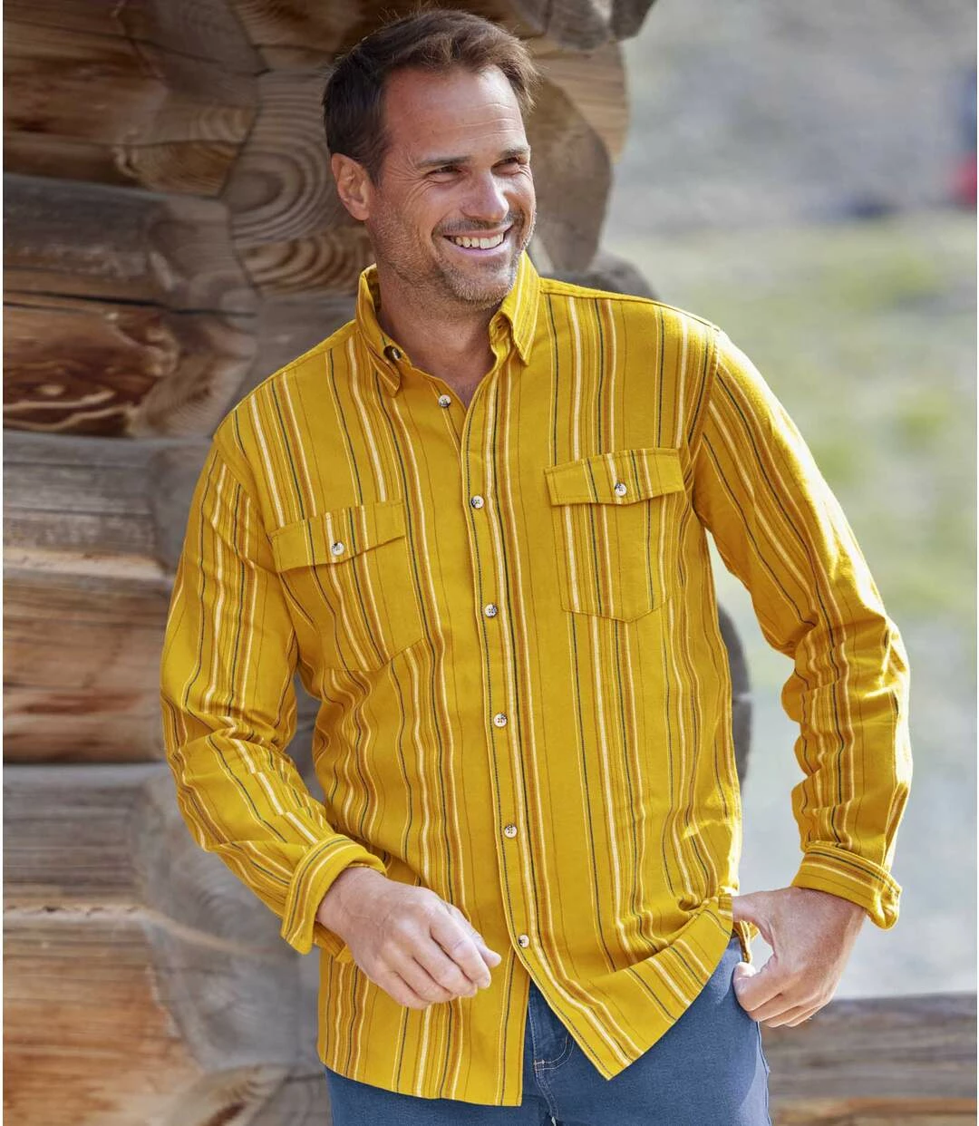 Gestreiftes Flanellhemd: Freuen Sie sich auf dieses Hemd in warmen Farben mit schmalen asymmetrischen Webstreifen! Der weiche, schmeichelnde Flanell (ca. 160 g/m²) verwöhnt mit herrlichem Tragegefühl. Lässiger Look mit 2 Brusttaschen mit Knopfklappe. Einwandfreier, bequemer Schnitt: Kentkragen, Knopfmanschetten, Rückenpasse mit 2 Bewegungsfalten, abgerundeter Saum. Knöpfe in Hornoptik. Rückenlänge bei Größe L: ca. 81 cm. Maschinenwaschbar bei 30°. Farbe: Ockergelb.