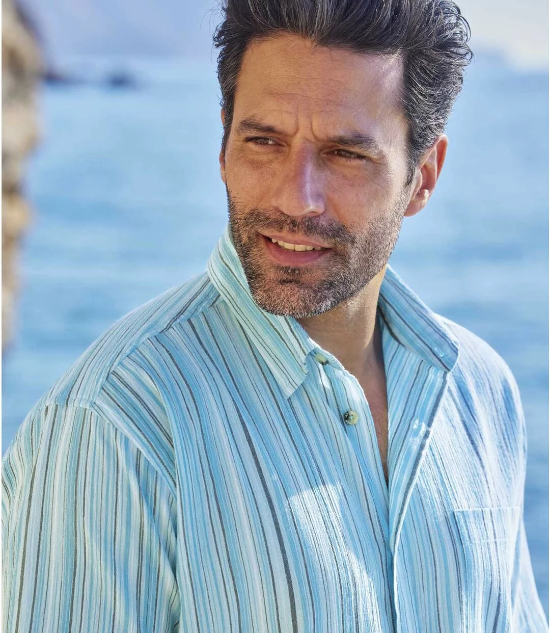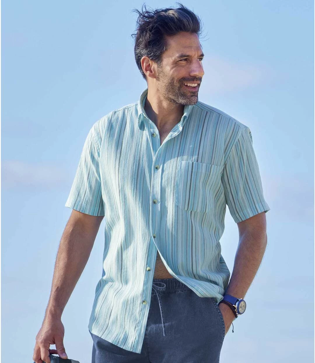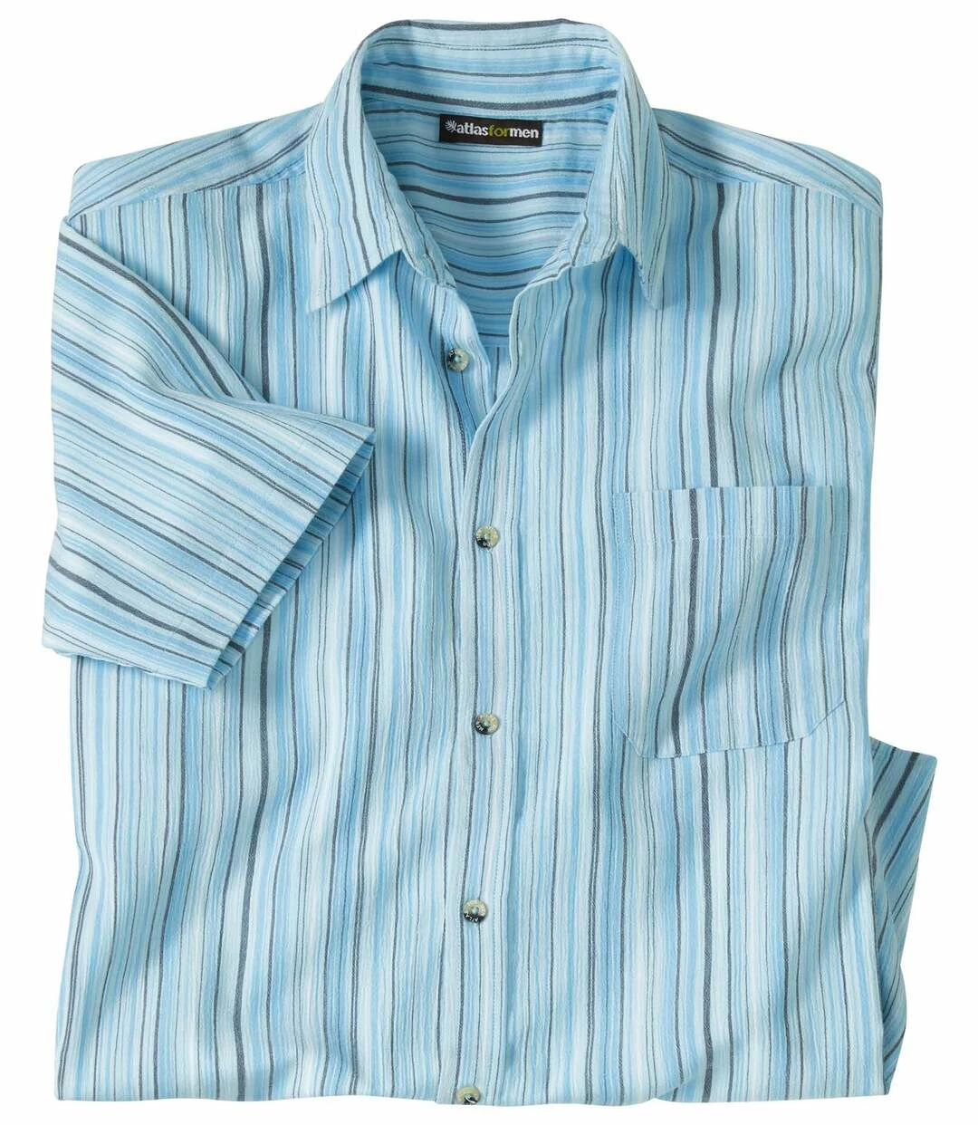 Gestreiftes Hemd Athena aus Krepp-Stoff: Nehmen Sie Kurs auf den Urlaub unter der Sonne des Mittelmeers! Das kurzärmelige Hemd wird aus gestreiftem Krepp-Stoff (ca. 110 g/m²) hergestellt. Dieses Material ist luftig-leicht und vor allem bügelfrei! Das Farbspiel mit frischen Blautönen wird Ihnen gefallen. Genießen Sie den Tragekomfort dieses sommerlichen Modells mit 2 Bewe-gungsfalten im Rücken und abgerundetem Saum. Kentkragen, Brusttasche. 60% Baumwolle, 40% Polyester. Rückenlänge bei Größe L: ca. 80 cm. Maschinenwaschbar bei 30°. Bügelfrei. Farben: Türkis mit Streifen
