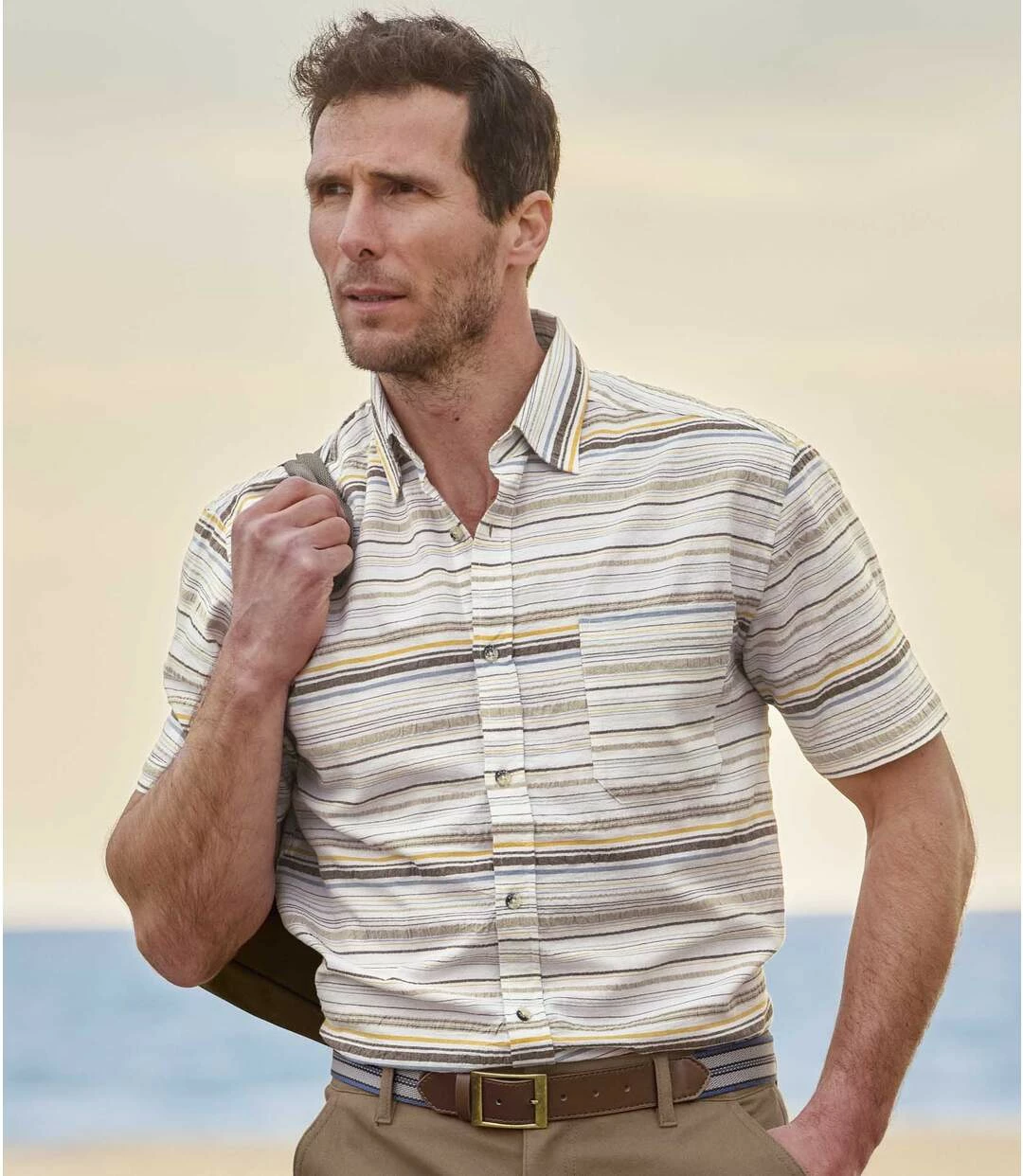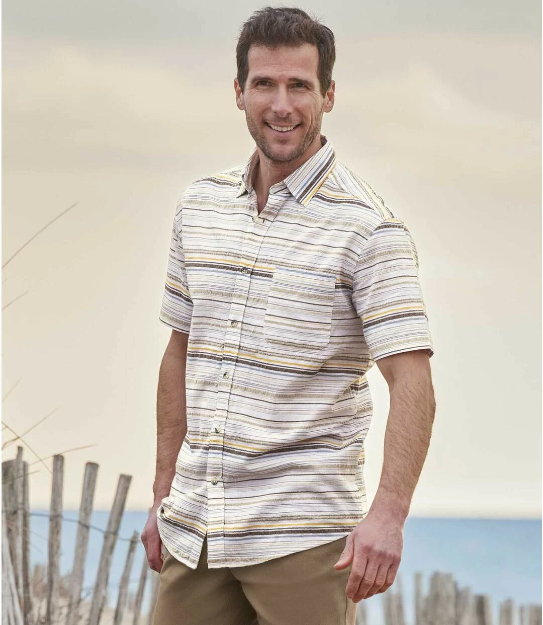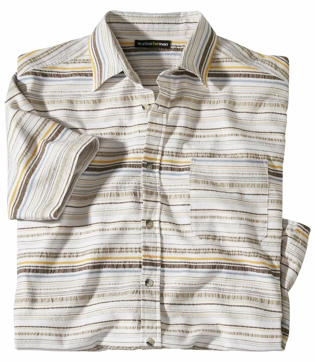Gestreiftes kurzärmeliges Sommerhemd: Ab in den Urlaub! Aber vergessen Sie dieses ultraleichte und unkomplizierte Hemd mit Waffel-Effekt und Webstreifen (ca. 110 g/m²) nicht! Weiter und bequemer Schnitt mit 2 Bewegungsfalten im Rücken und abgerundetem Saum. 1 Brusttasche. Der große Vorteil: Das Hemd ist bügelfrei! 100% Baumwolle. Rückenlänge bei Größe L: ca. 80 cm. Maschinenwaschbar bei 30°. Bügelfrei. Farben: Rohweiß mit Streifen – Art.-Nr.: K4124