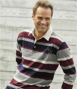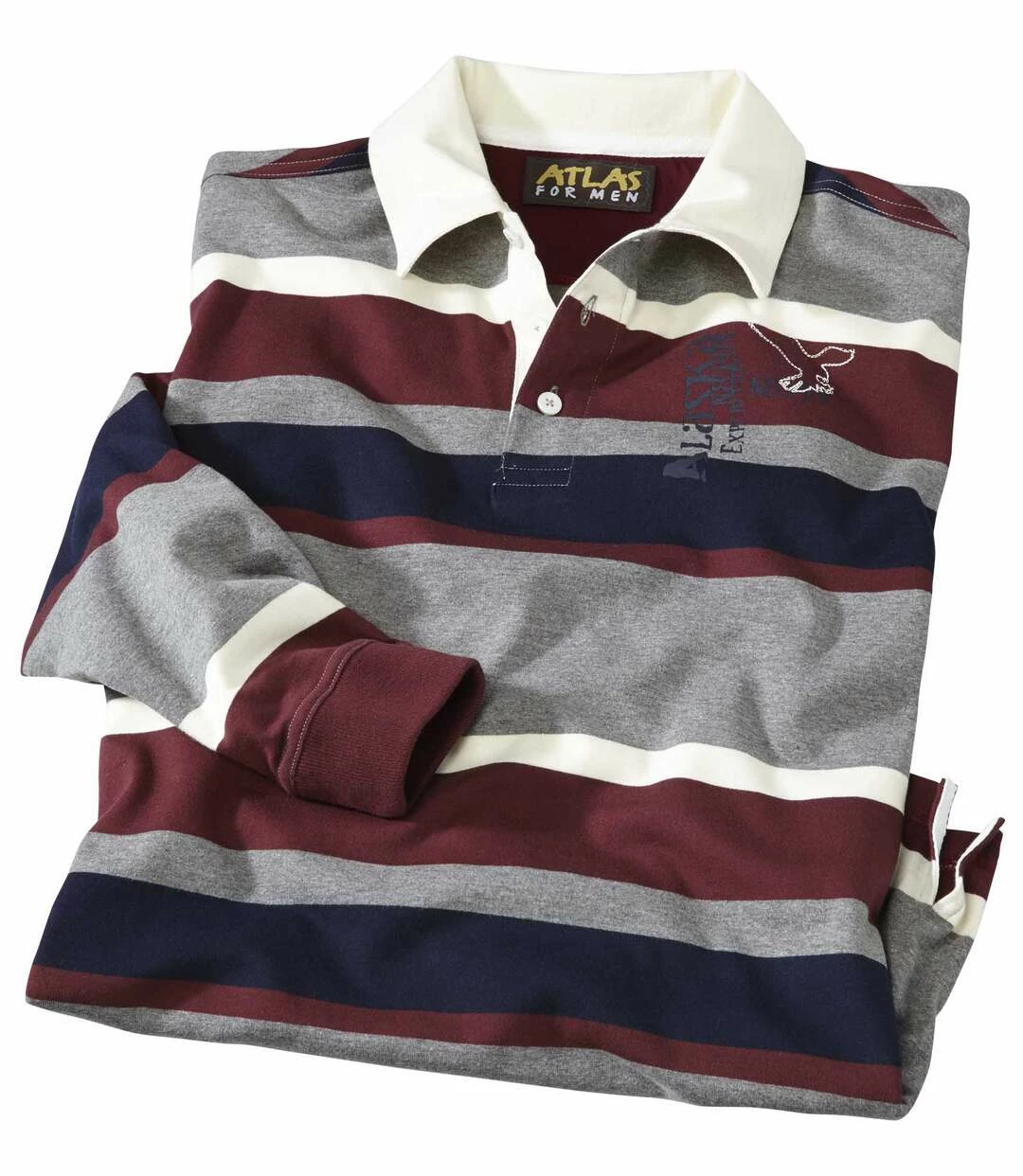 Gestreiftes Poloshirt “Rugby”: Dieses Poloshirt aus herrlichem Jersey besticht durch seine leuchtenden Webstreifen. Weiter und bequemer Schnitt mit geradem Saum mit Seitenschlitzen und Doppelnähten. Jerseykragen und kontrastierend unterlegte Knopf-leiste in Natur, elasthanverstärkte Bündchen. Brustaufdruck. 70% Baumwolle, 30% Polyester (ca. 210 g/m²). Maschinenwaschbar bei 30°. Farbe: Streifen in Grau, Marine, Rot und Natur – Art.-Nr.: Q0047