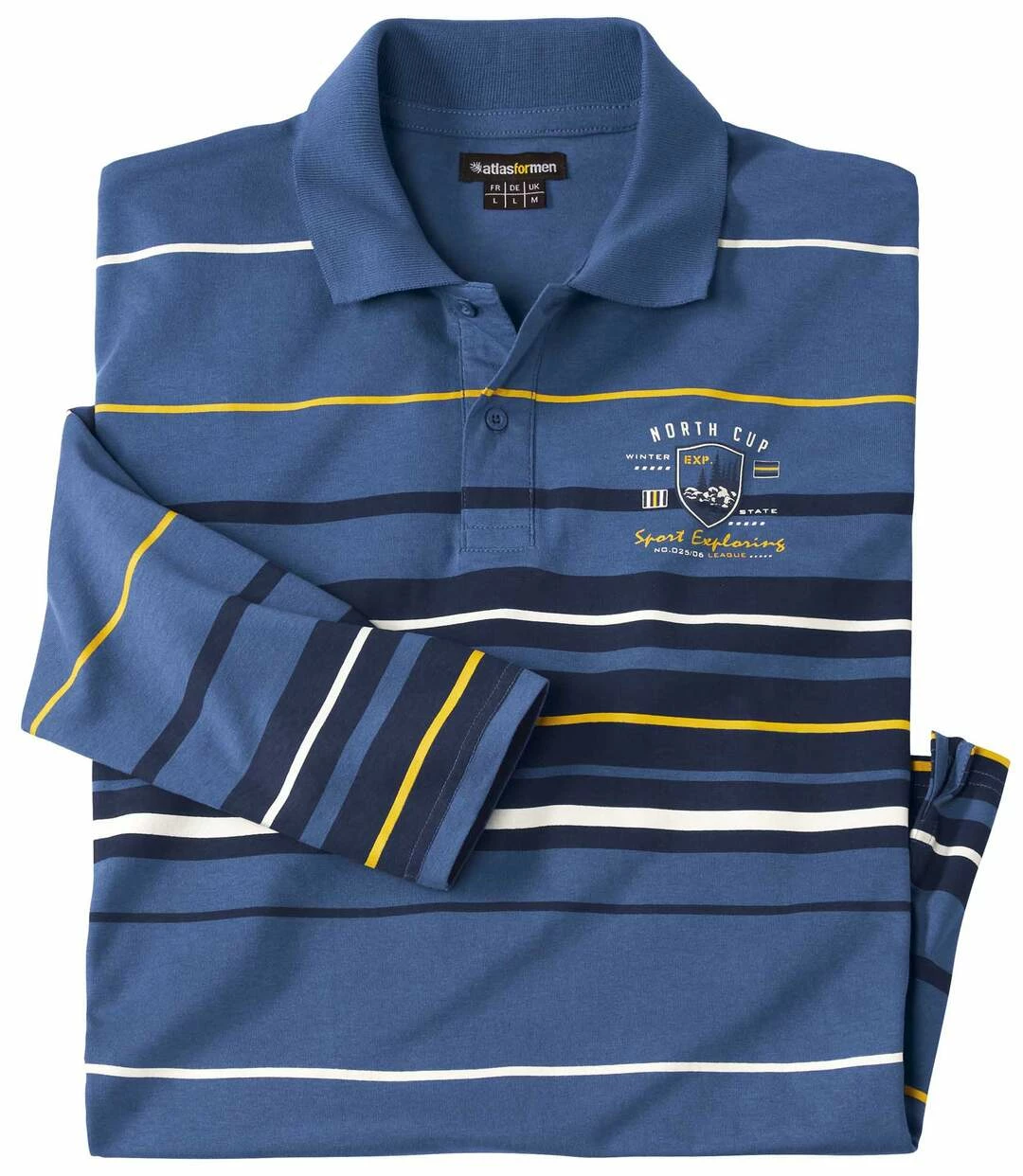 Gestreiftes Poloshirt Sport Exploring: Dieses superbequeme gestreifte Poloshirt mit langen Ärmeln wird aus weicher und anschmiegsamer Baumwolle (ca. 180 g/m²) hergestellt. Doppelnähte am Saum und an den Ärmeln sorgen für Formstabilität. Weiter Schnitt mit verstärkten Seitenschlitzen am Saum. Modischer Brustaufdruck. Dunkelblaue Knöpfe. Rückenlänge bei Größe L: ca. 74 cm. Maschinenwaschbar bei 30°. Auf Links bügeln wegen des Aufdrucks. Farbe: Blau.