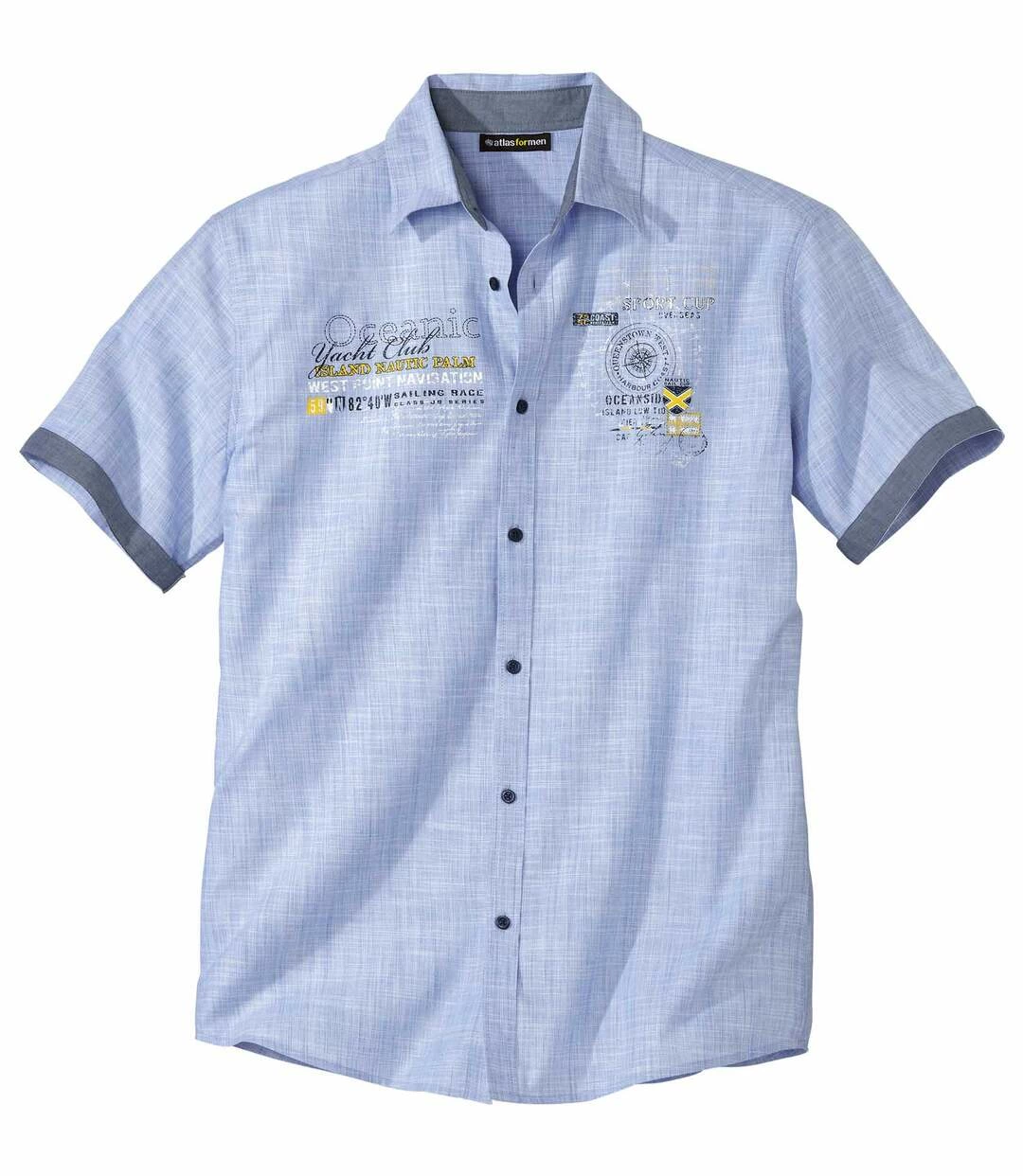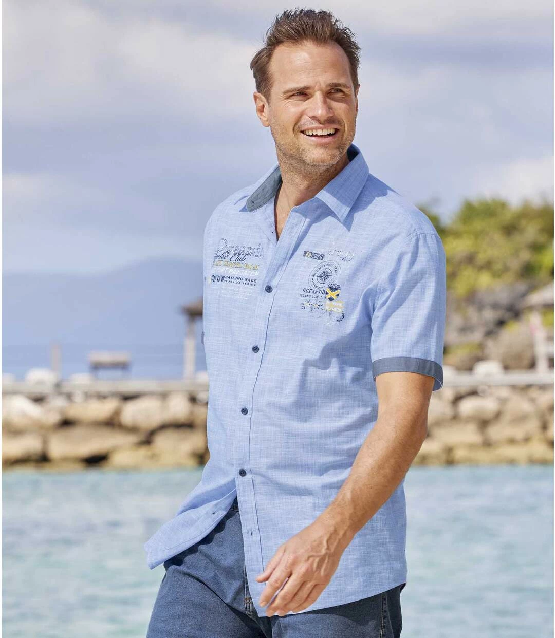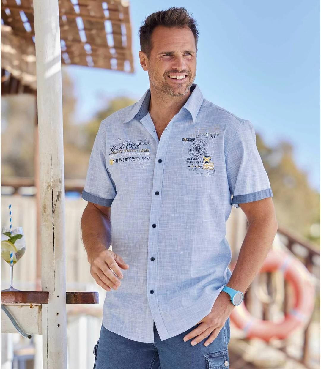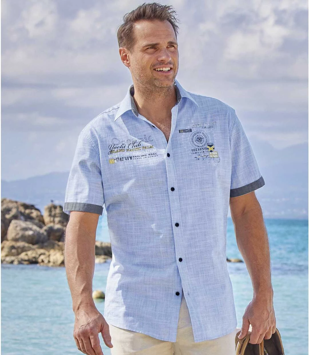 Hemd Island Nautic in geflammter Baumwolle: Haben Sie Lust auf ein kurzärmeliges Hemd mit lässigem Chic? Dieses Modell verwöhnt mit leichtem und weichem Popelin in geflammter Optik (ca. 110 g/m²), der sich sehr sanft anfühlt. Überlegte Details machen bei diesem Modell den Unterschied: Die Krageninnenseite sowie die Revers der Ärmel sind in Chambray abgesetzt. Die herrlichen Brustaufdrucke erinnern an einen Yacht-Club. Weiter Schnitt mit 2 Bewegungsfalten im Rücken und abgerundetem Saum. Kentkragen. 100% Baumwolle. Rückenlänge bei Größe L: ca. 80 cm. Maschinenwaschbar bei 30°. Farbe: Blau – Art.-Nr.: H6111