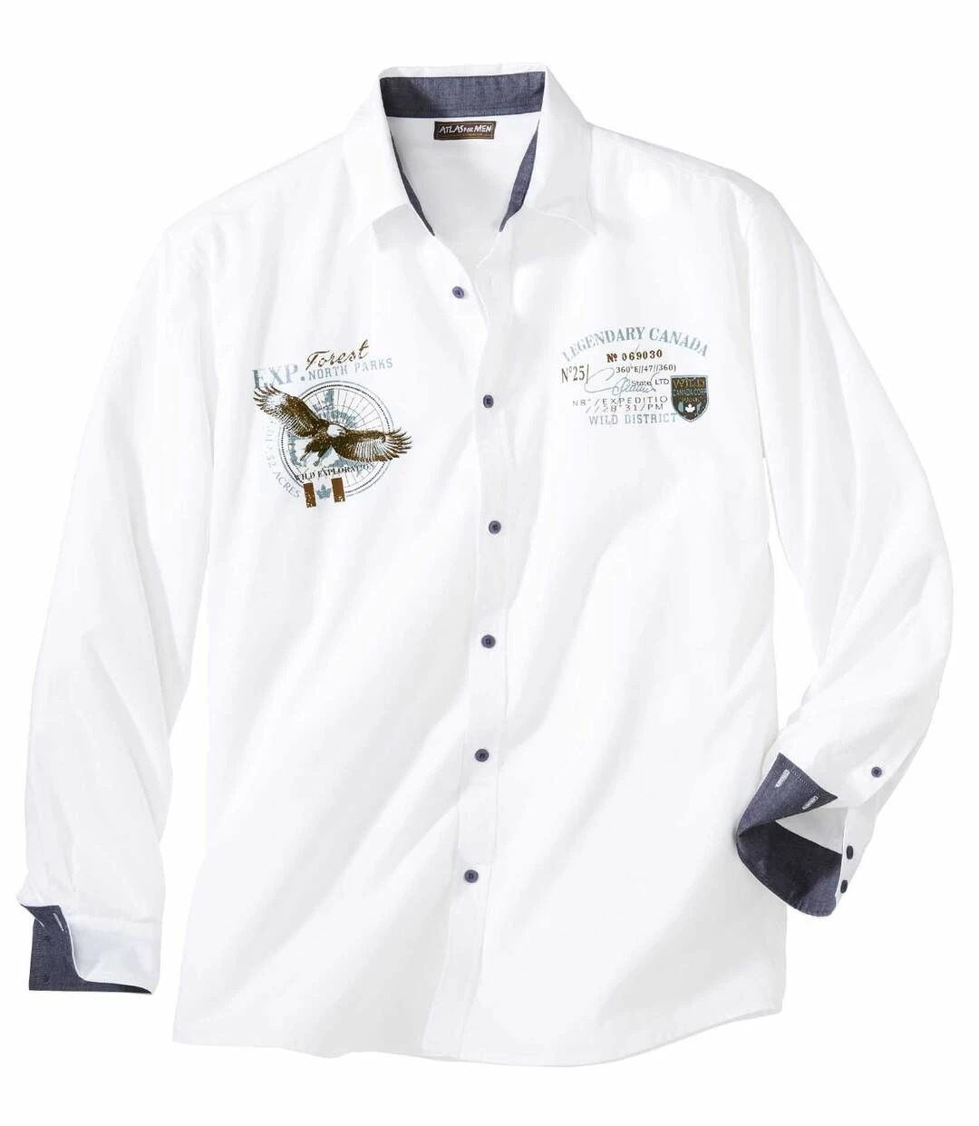 Hemd North Expedition: Dieses Hemd in klassischem Weiß überzeugt mit ausgesprochen stylischen Details: Auf der Brust prangen 2 schöne Aufdrucke im Wappenstil mit einem Adlermotiv. Die in grauem Chambray abgesetzten Innenseiten von Kragen und Manschetten verleihen dem Modell seinen extravaganten Look. Der Popelin (ca. 120 g/m²) fühlt sich weich und leicht an. Der Schnitt mit 2 Bewegungsfalten im Rücken verwöhnt mit Tragekomfort. Knopfmanschetten, abgerundeter Saum. 100% Baumwolle. Rückenlänge bei Größe L: ca. 81 cm. Maschinenwaschbar bei 30°. Auf Links bügeln wegen des Aufdrucks. Farbe: Weiß – Art.-Nr.: V1022 07