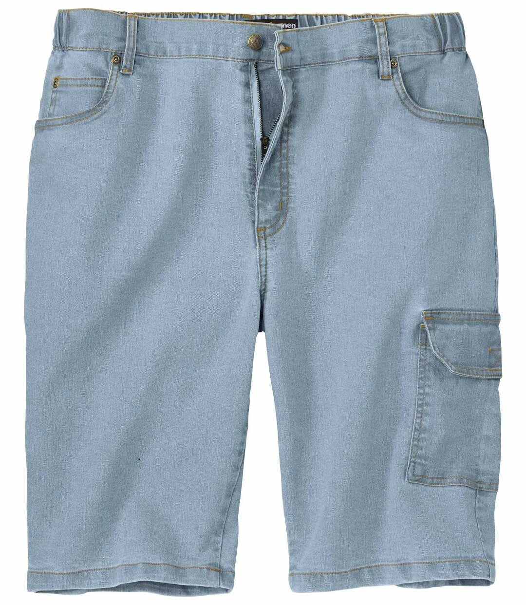 Jeans-Bermuda im Cargo-Stil mit Stretch-Effekt: Wenn Sie ein Jeans-Fan sind, dann greifen Sie zu dieser Sommer-Bermuda aus leichtem Stretch-Denim (9,5 oz)! Der zu 3/4 elastische Bund mit Schlaufen garantiert ein angenehmes Tragegefühl. Zusätzlich zu den 5 klassischen Taschen (2 Einstecktaschen und 1 Münztasche mit Nieten vorne und 2 aufgesetzte Gesäßtaschen) hat diese Bermuda eine Cargo-Tasche mit Klettklappe. Reißverschluss mit Abschlussknopf aus Metall. Ockerfarbene Nähte. 81% Baumwolle, 17% Polyester, 2% Elasthan. Schrittlänge bei Größe L: ca. 30 cm, Beinweite: ca. 26 cm. Maschinenwaschbar bei 30°. Farbe: Hellblau.